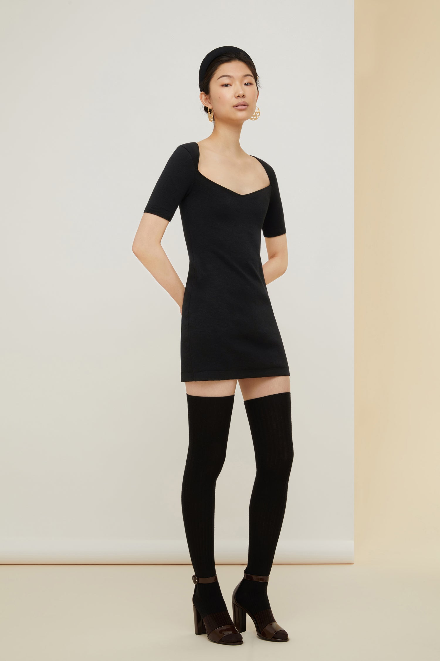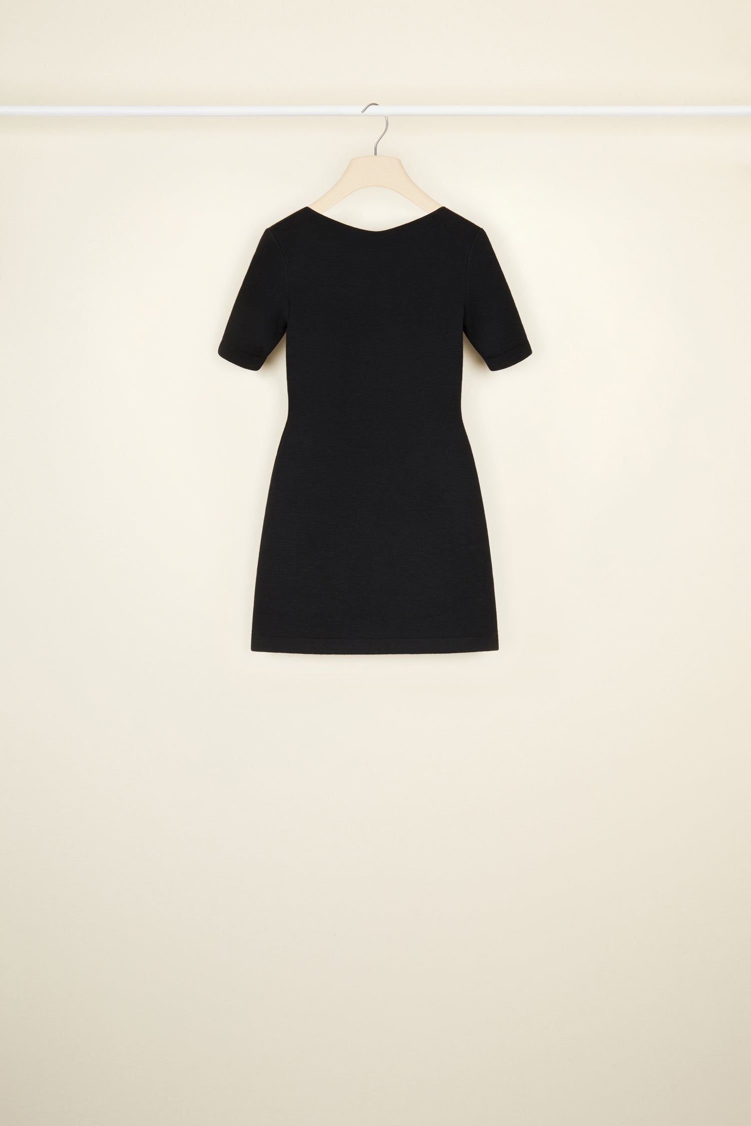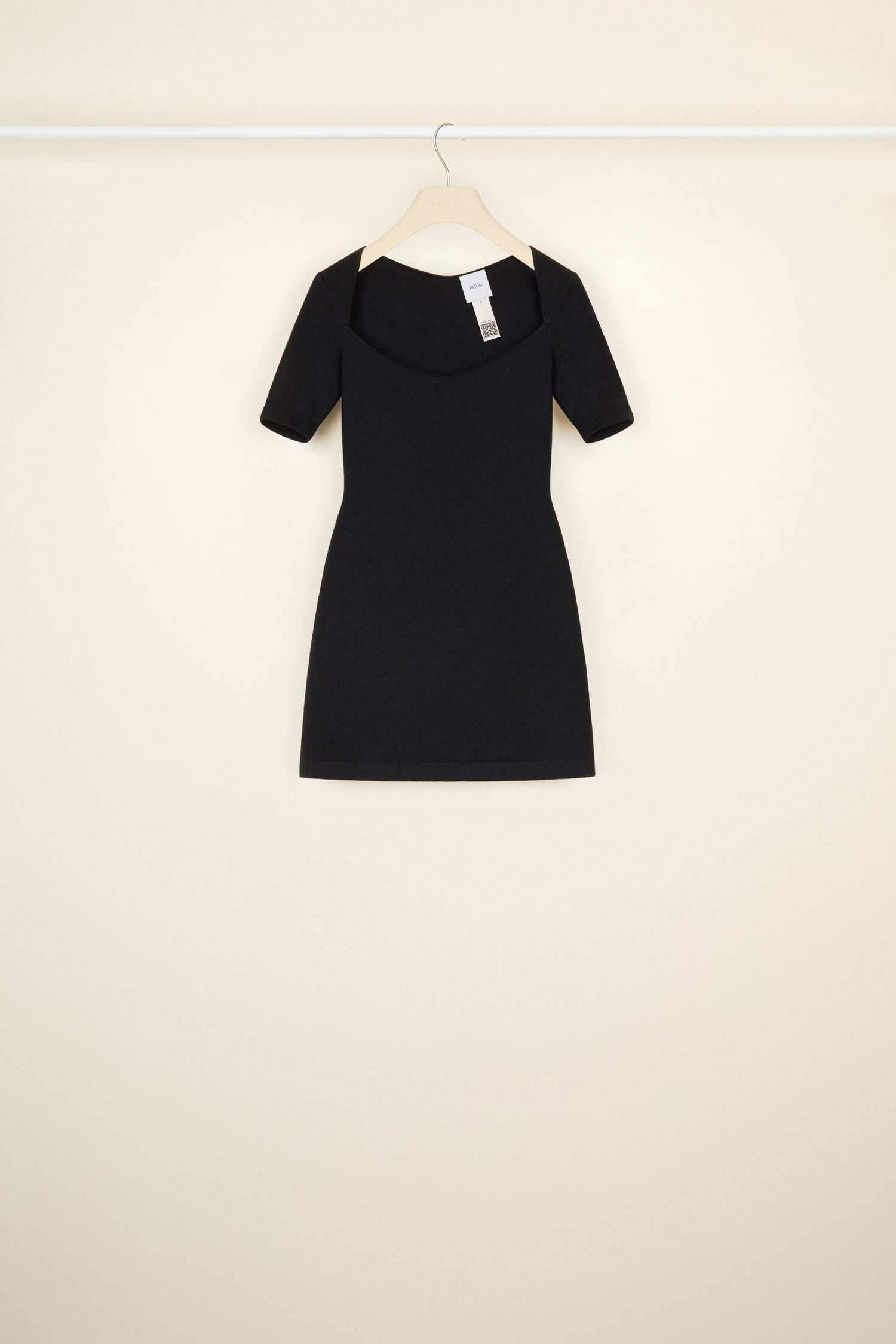 Black knit mini dress. Fitted silhouette. Sweetheart neckline. Detachable balloon sleeves in eco-friendly black faille with elasticated wrists.