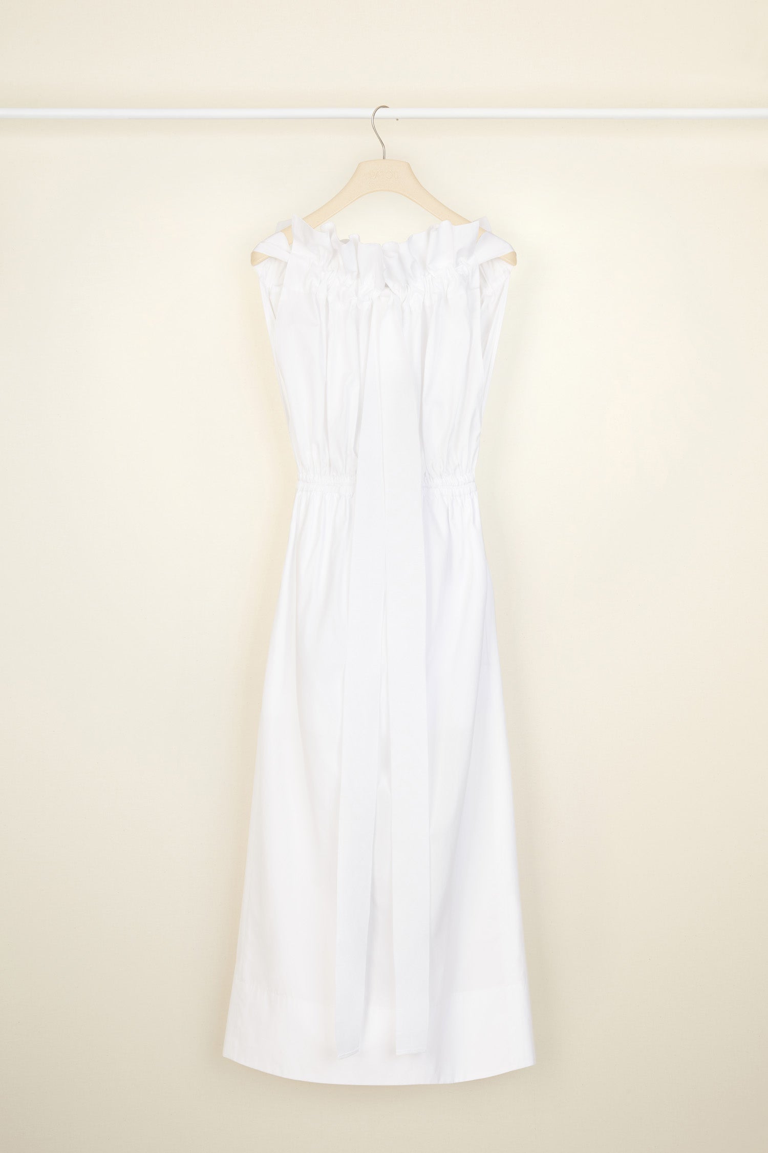 White organic cotton dress. Elasticated neckline with grosgrain. Can be worn off the shoulders. Buttons and zip at the back. Elasticated waist. Central split at the back.