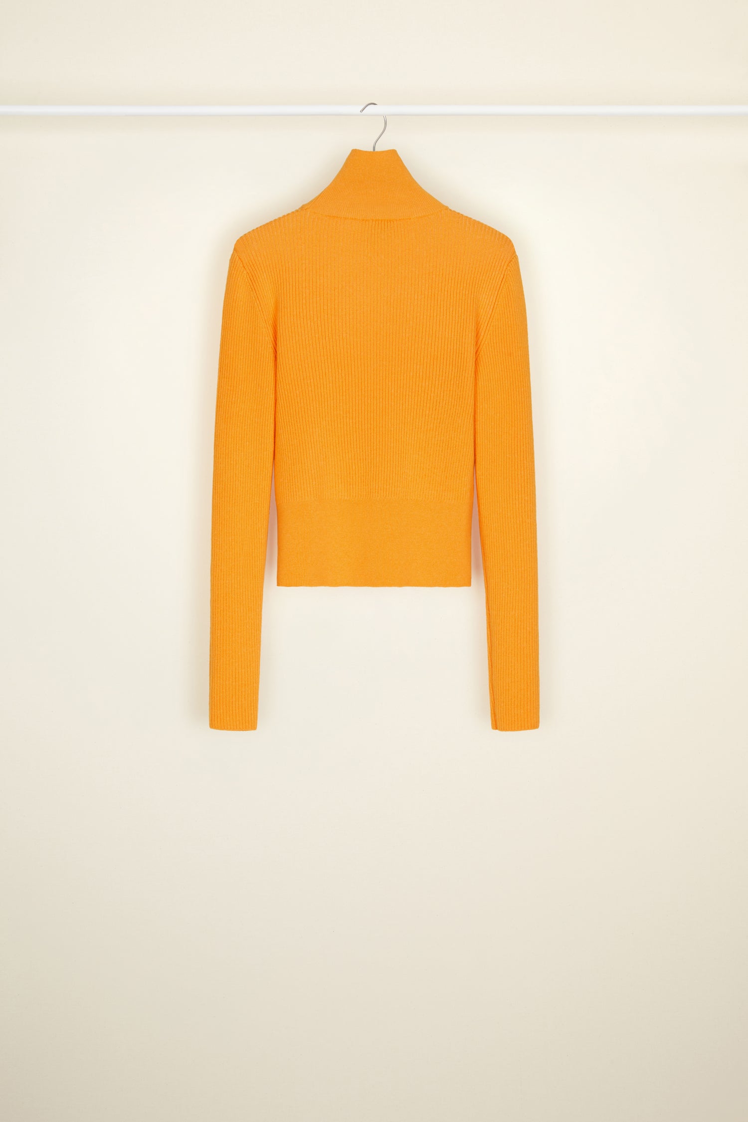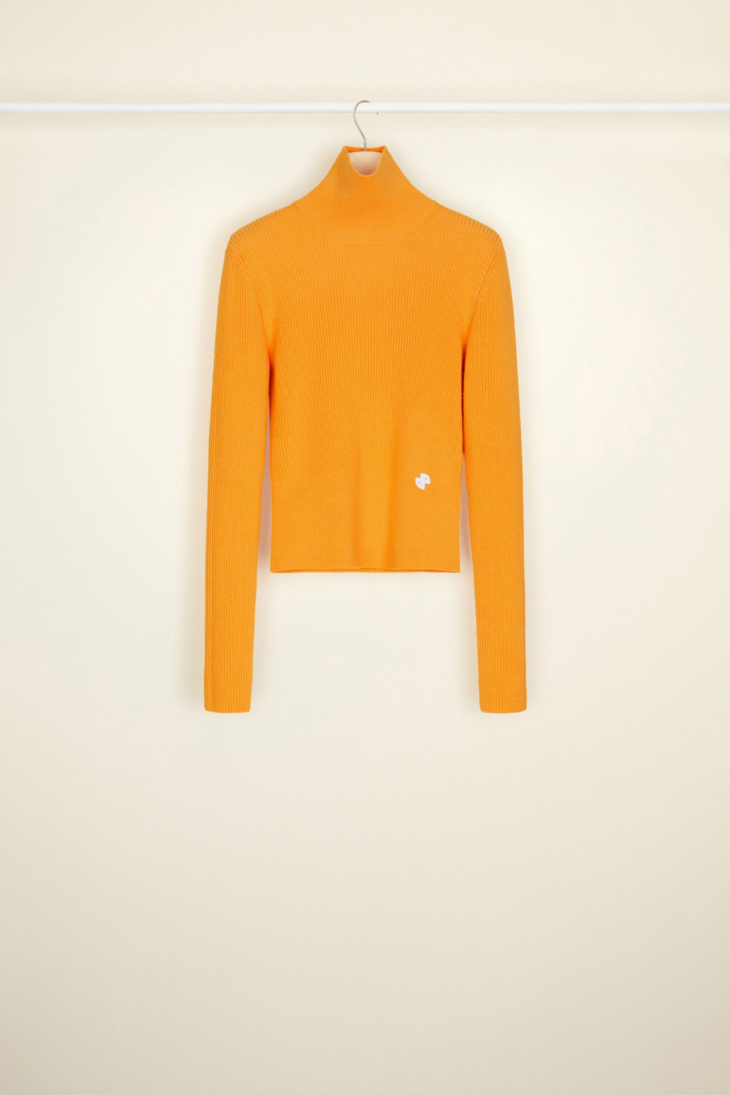 Orange rib knit jumper. Fitted style with a high neck. Cropped silhouette. Small white JP logo at the front.
