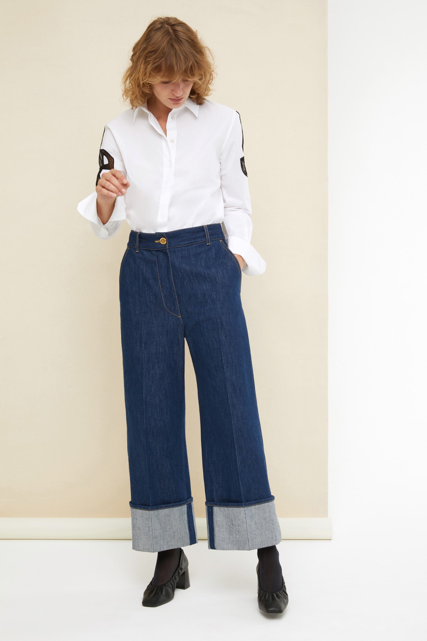 White organic cotton shirt with contrasting embroideries. Spread collar. Concealed button fastening; buttoned cuffs. Side vents. Stylised JP logo embroidered in black on both sleeves; black Patou logo on the left cuff.