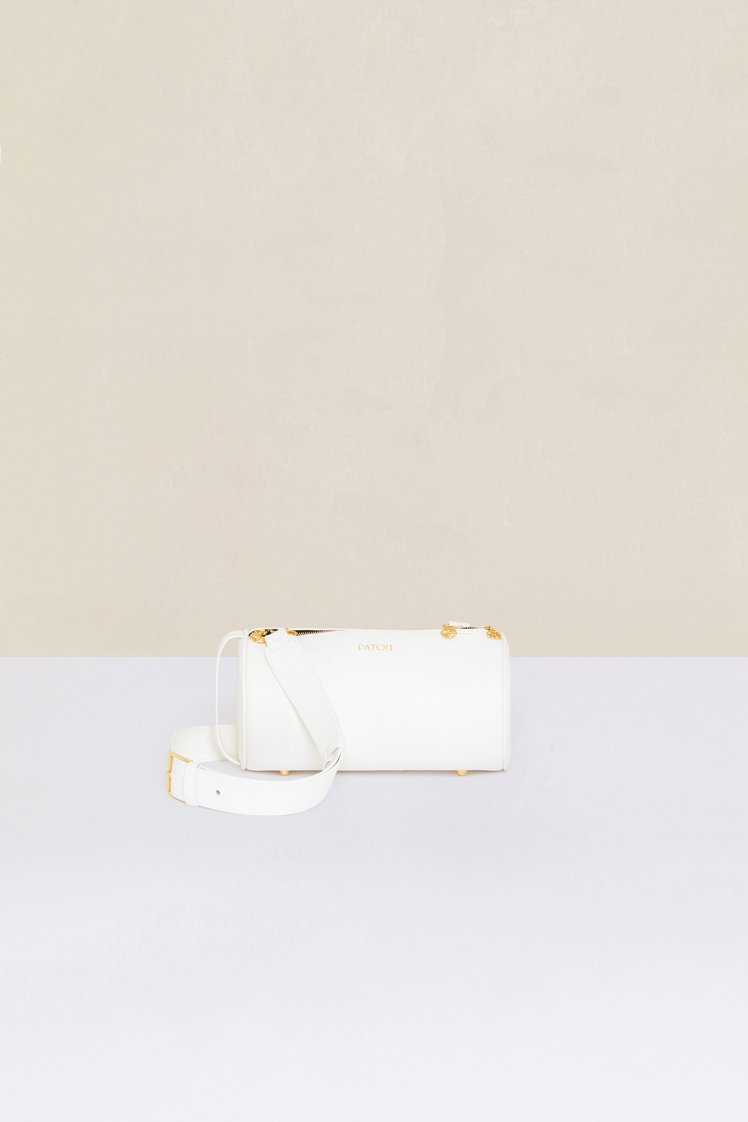 White faux leather handbag. Barrel shape inspired by a pétanque bag. Adjustable strap that can be worn short or long. Gold-coloured hardware. Multiple zip tabs with JP logo inspired by a heritage keyring. Patou lettering logo. Small pocket inside.