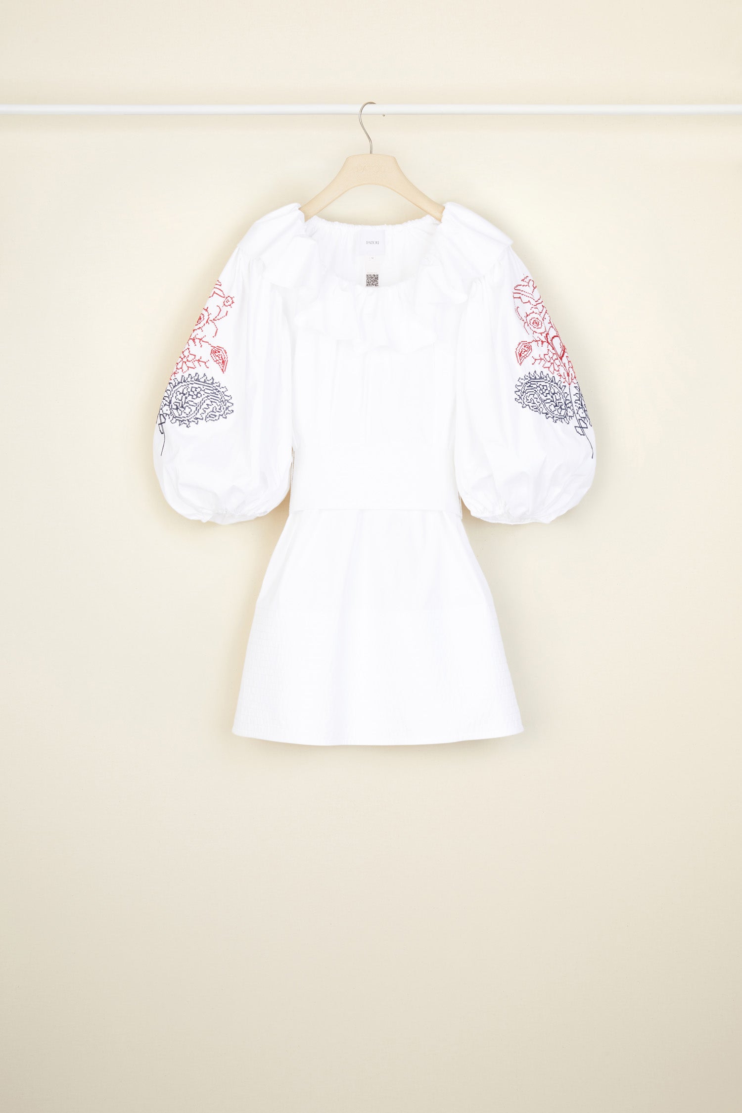 White organic cotton mini dress. High volume silhouette that can be cinched at the waist via a removable belt. Puff sleeves with elasticated cuffs featuring blue and red embroideries. Elasticated neckline with a ruffle that can be worn off the shoulders.