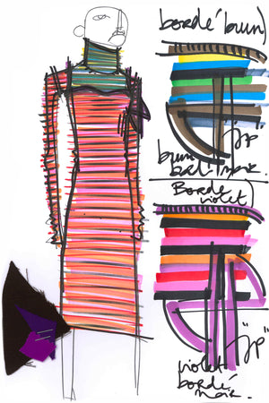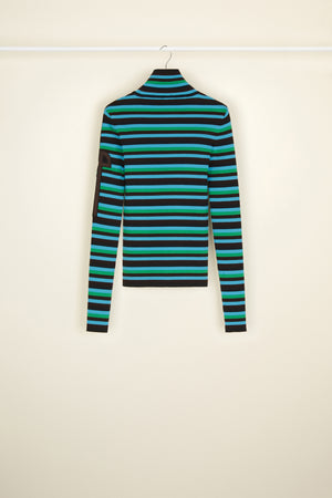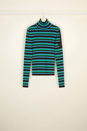 Green rib knit jumper adorned with multicoloured stripes. Fitted style with a high neck. Embroidered JP logo on the left sleeve in brown with black piping.