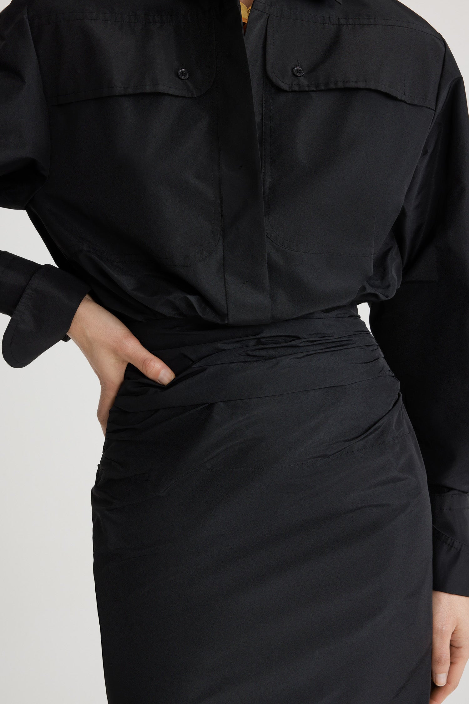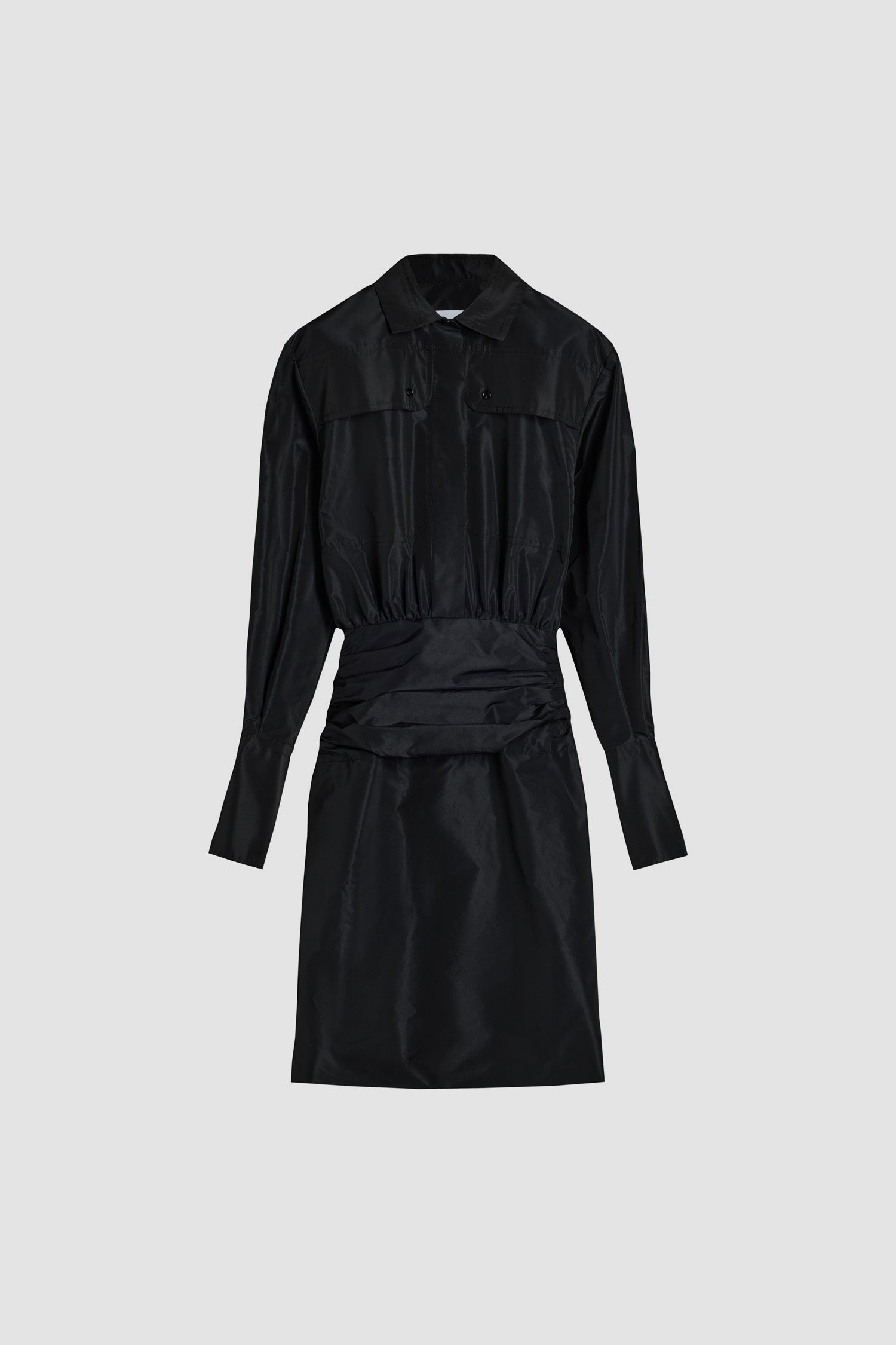 Black recycled polyester faille dress. Straight silhouette. Shirt collar. Concealed JP-engraved mother-of-pearl buttons. High chest flap pockets. Buttoned French cuffs. Ruching at the waist.