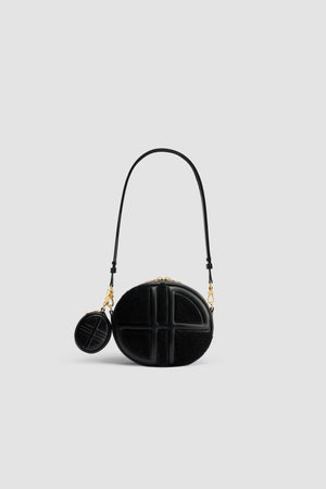 Sac en cuir et peau retournée noirs. Forme ovale avec JP 3D sur le devant. Patou embossé au dos. Zip à double curseur. Bandoulière réglable et amovible. Pièces métalliques dorées. Doublure éco-responsable.
