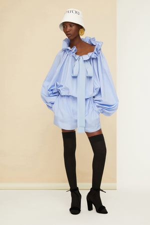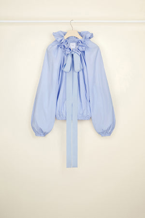 Haut en coton bio bleu aurore. Silhouette volumineuse à porter de deux façons : nouée au col ou découvrant les épaules. Col à coulisse avec détail de fronce et gros-grain. Manches chauve-souris resserrées aux poignets. Taille élastiquée.
