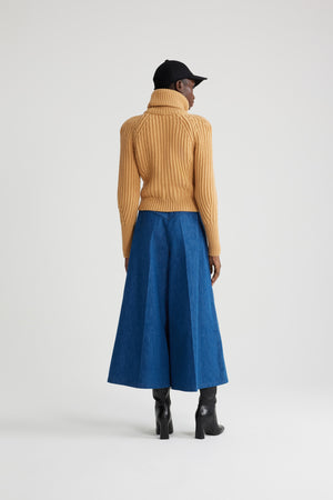 Pantalon en denim bio bleu délavé. Jambe large. Taille haute.Fermeture par bouton doré gravé Patou et zip sur le devant. Passants de ceinture, poches latérales. Plis sur le devant.