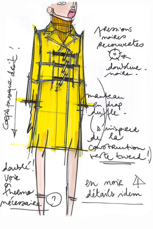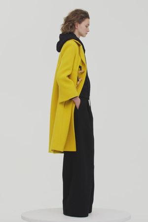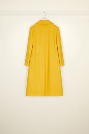 Manteau en mélange laine et cachemire jaune safran. Silhouette longue et légèrement évasée. Fermeture par boutons en bois de style appeau ainsi que par des pressions cachées. Deux grandes fausses poches à rabat ; deux poches sur les côtés. Étiquette Patou brodée sur la manche gauche.