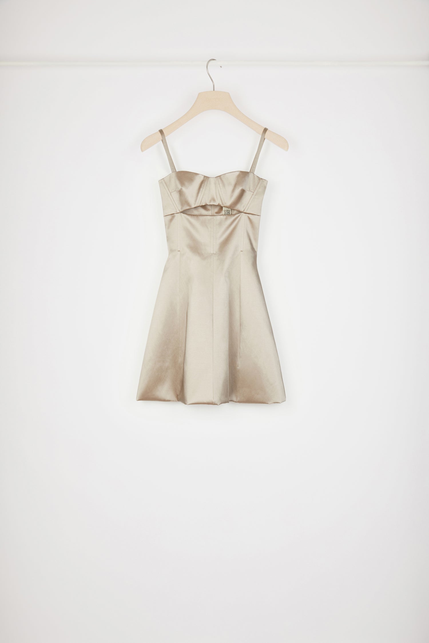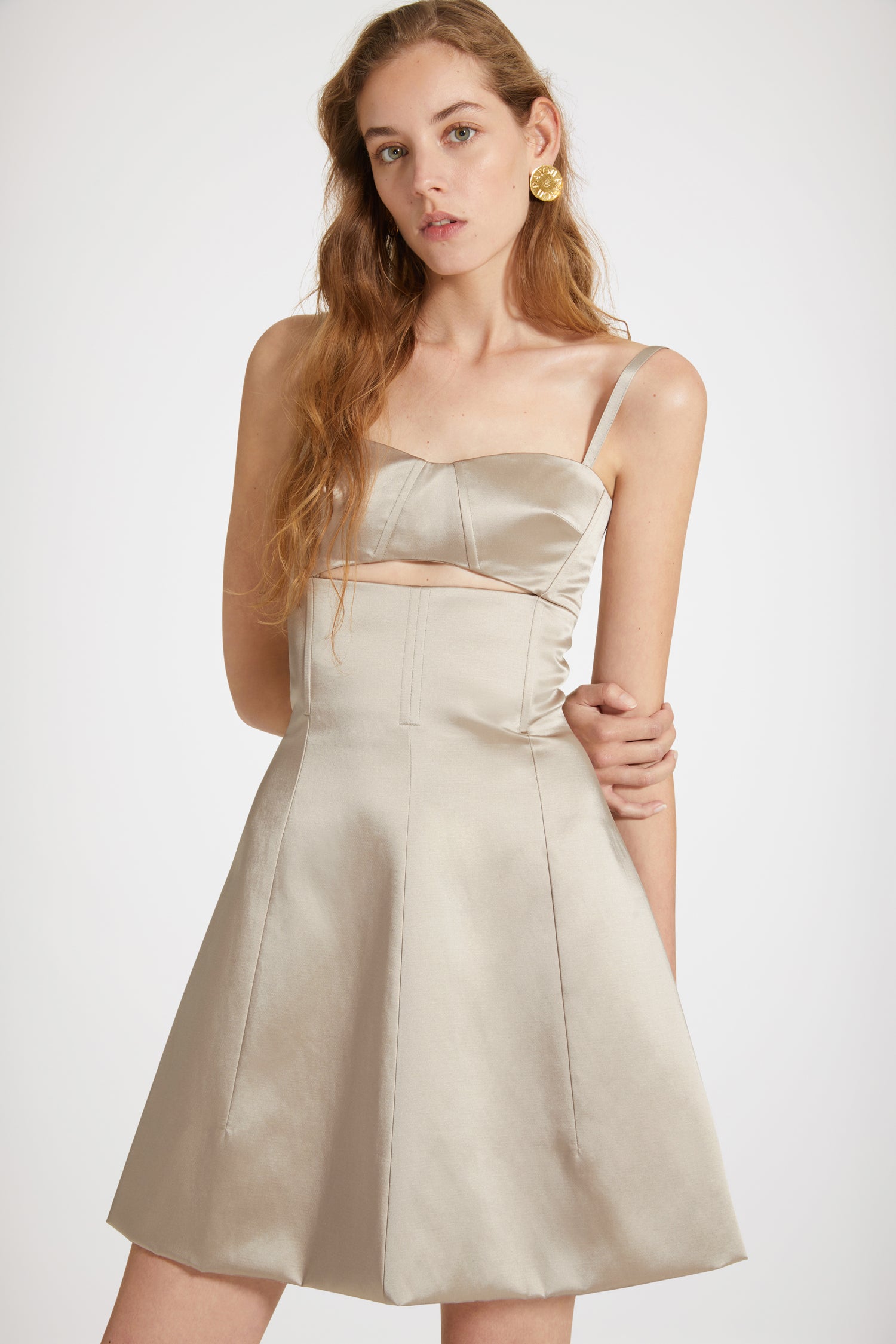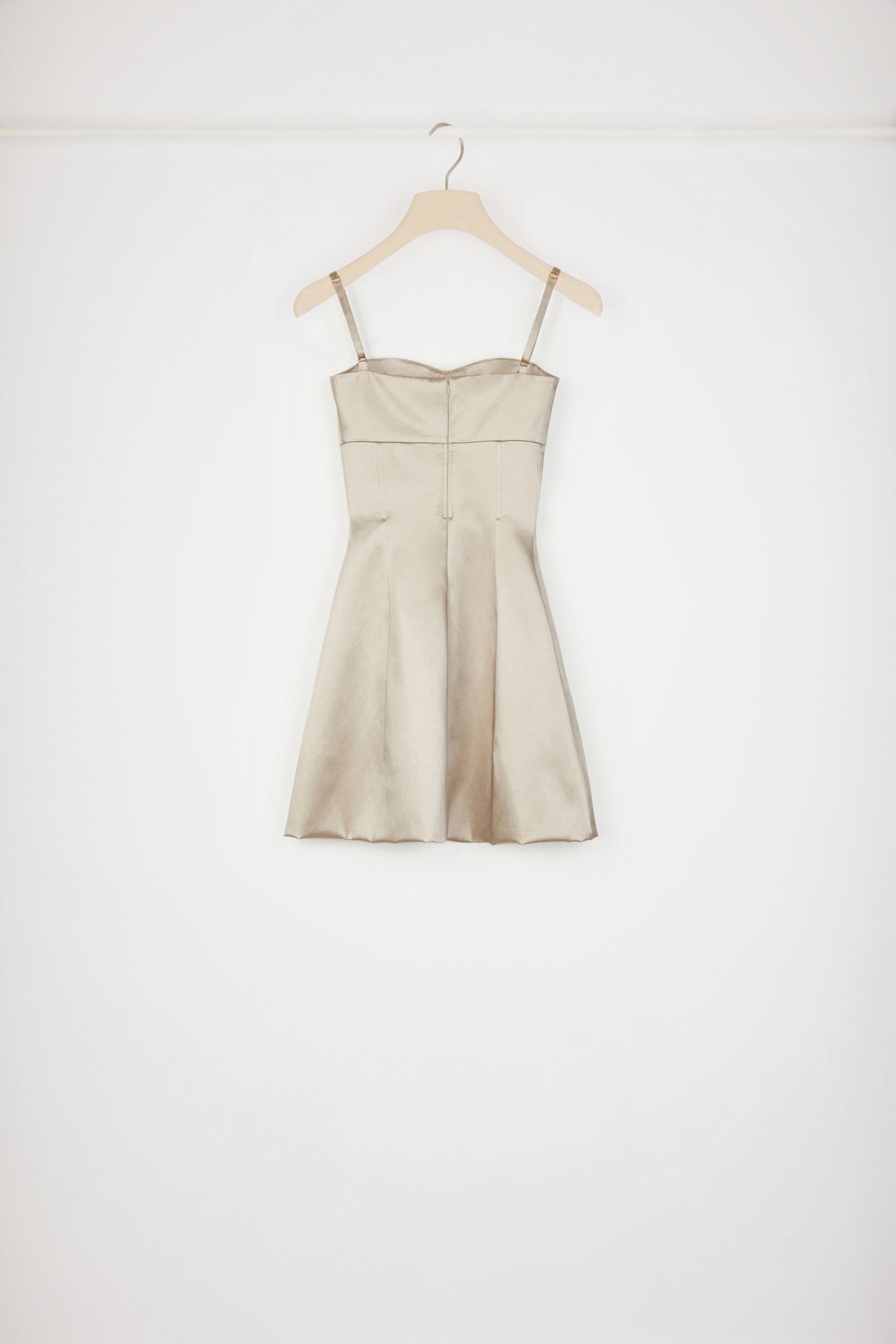 Robe en satin de coton bio mélangé gris tour Eiffel. Silhouette ajustée et évasée. Bretelles réglables esprit lingerie. Corsage moulé avec baleines et découpe sur le devant. Zip au dos. Coutures sur la jupe. Ourlet double.