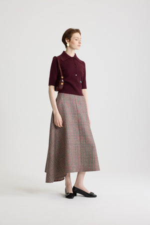 Jupe en flanelle de laine vierge éco-responsable. Motif prince-de-galles. Longueur midi. Taille mi-haute. Silhouette asymétrique avec plis d’un côté. Boutons-pression argentés gravés du monogramme JP sur le côté, fermeture par zip à l’arrière. Une poche latérale arrondie. Modèle doublé.