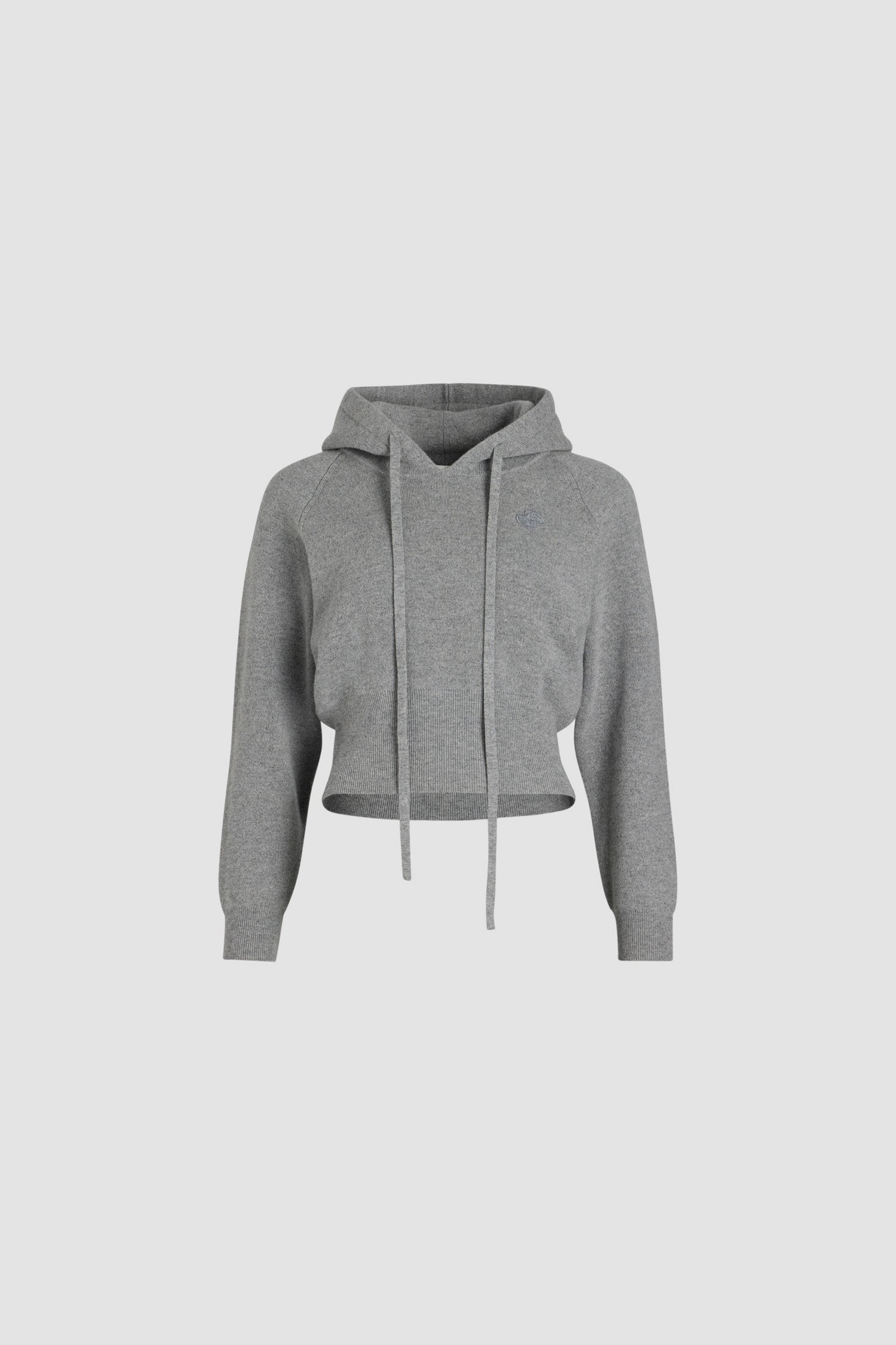 Pull en mélange de laine et cachemire éco-responsable gris. Silhouette décontractée. Col à capuche. Manches raglan. Patch JP en bouclette à la poitrine. Poignets et ourlet côtelés.