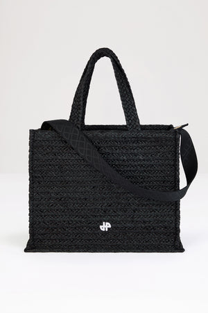 Panier en raphia noir. Monogramme JP noir sur le devant. Bandoulière ornée de JP embossés avec détail de boutons dorés gravés Patou. Double anse. Peut se porter à la main ou sur l'épaule.