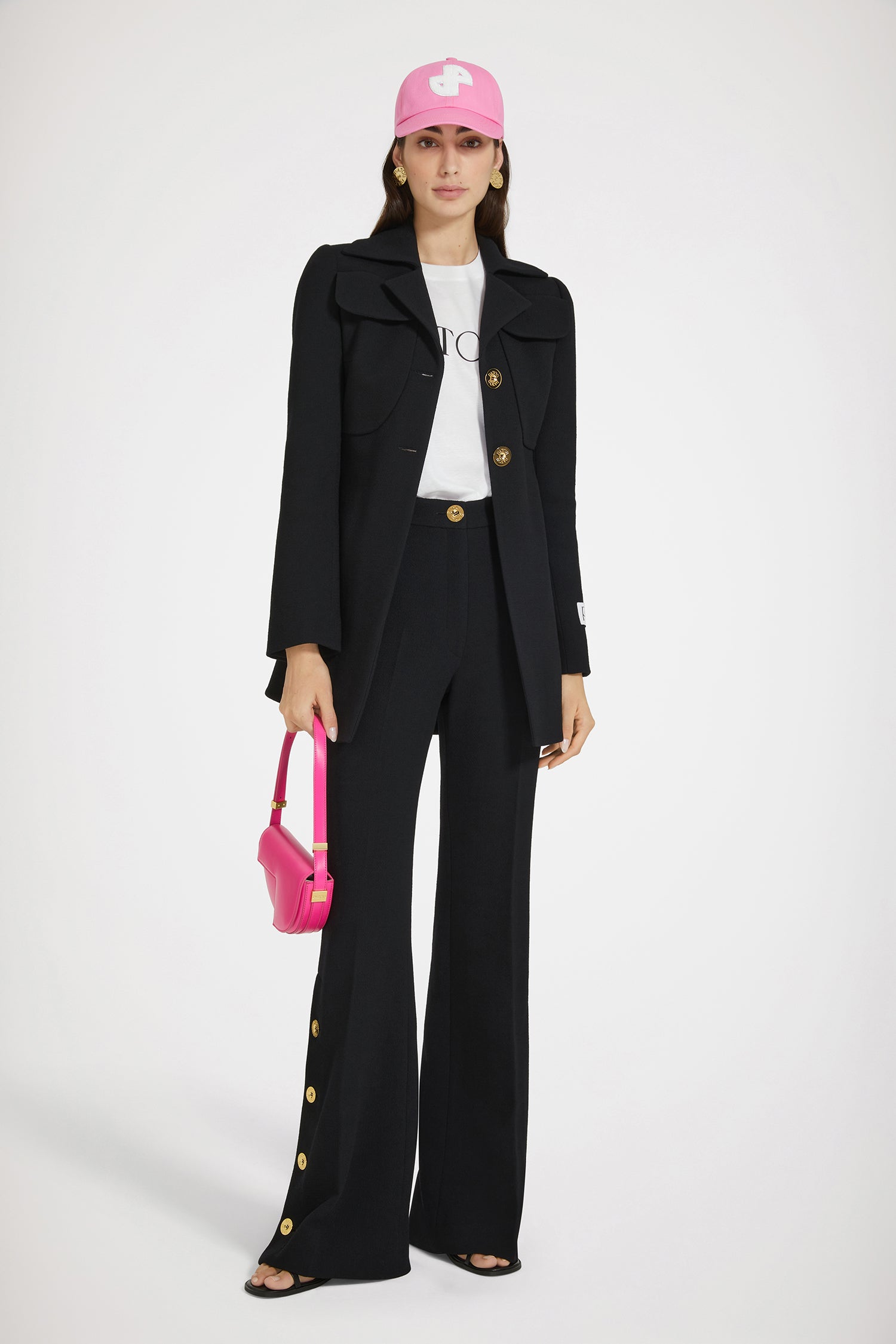 Pantalon en double crêpe de laine noir. Jambe évasée. Taille haute. Boutons dorés gravés Patou. Fermeture par boutons à l'avant. Fermeture éclair cachée. Poches arrondies sur le devant. Plis pressés sur le devant et au dos. Boutons en bas de jambe.