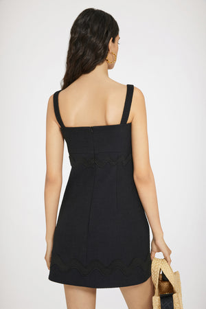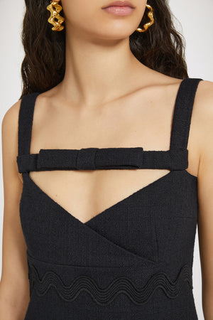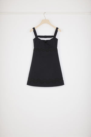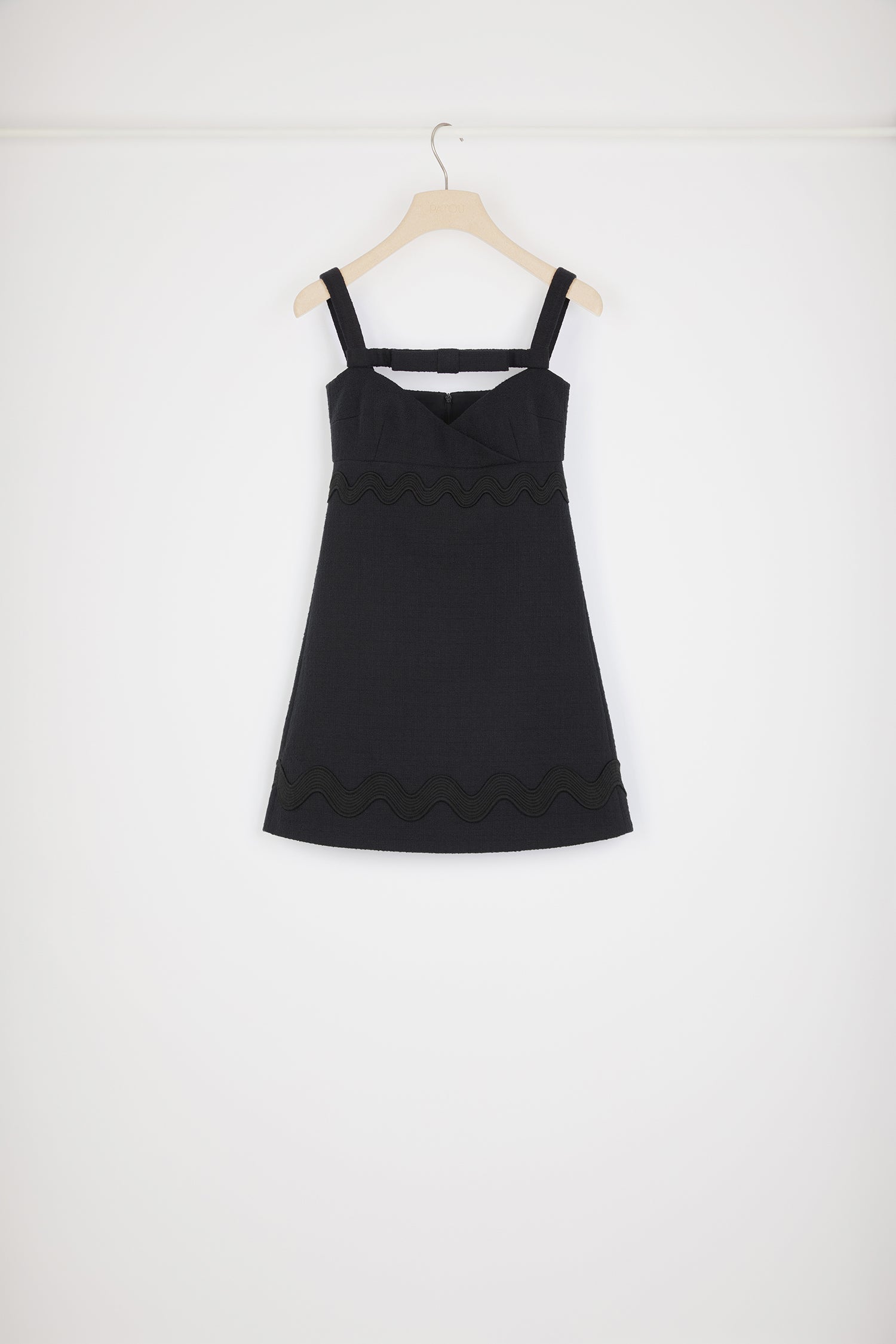 Robe en tweed de coton noir. Modèle court. Encolure coeur avec jeux de découpes et noeud. Bretelles larges. Fermeture par zip au dos. Galons ondulés.