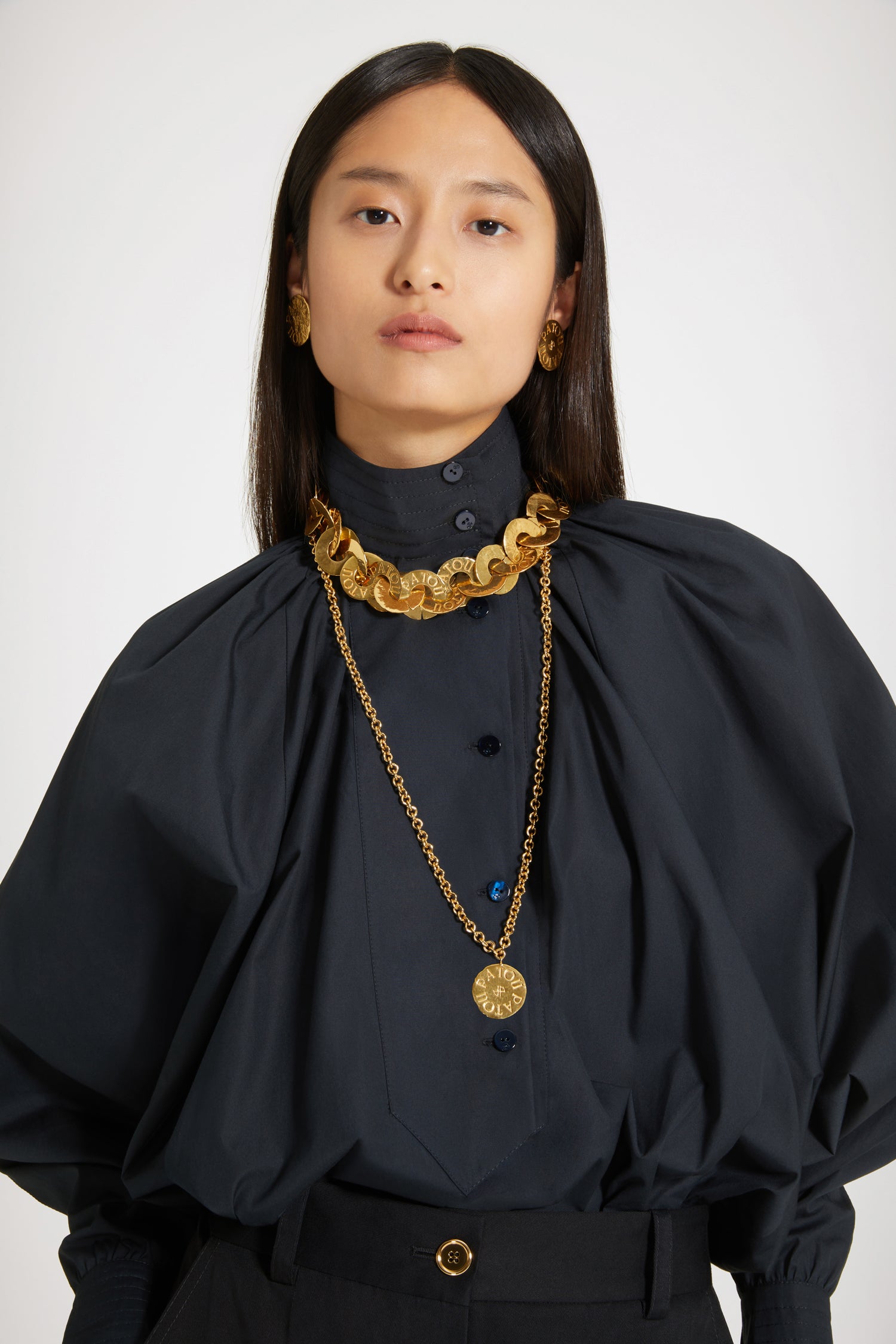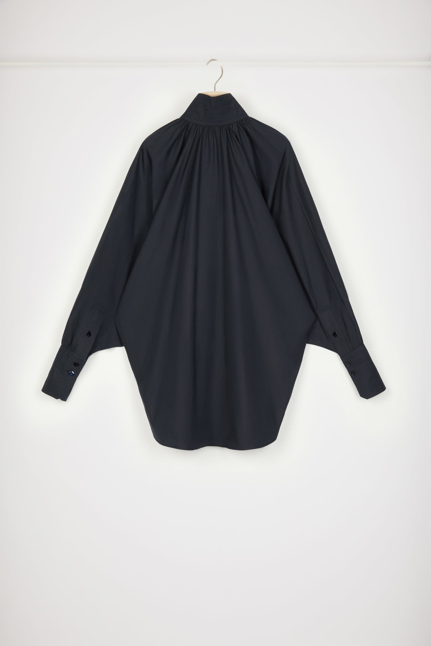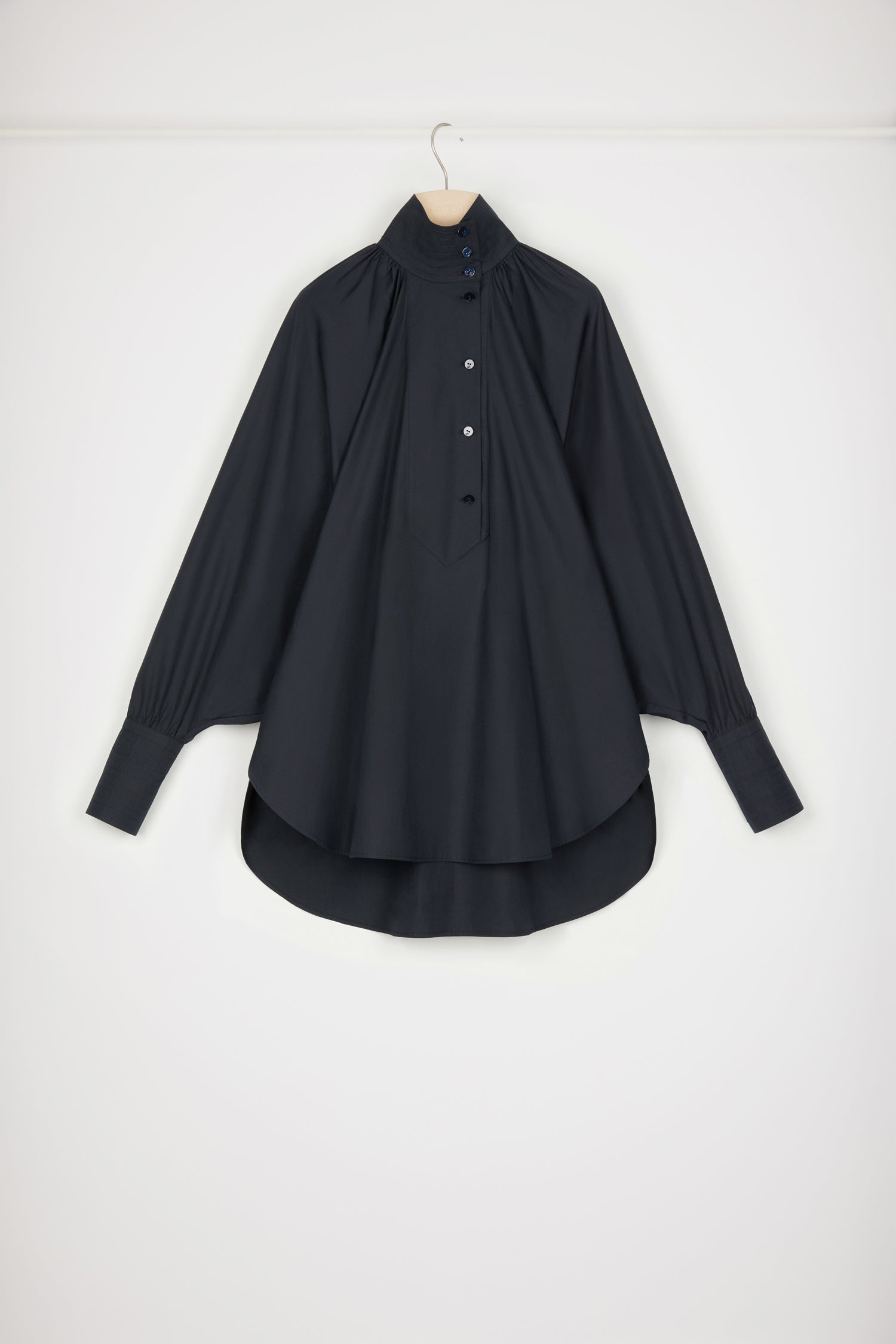 Blouse en coton bio noir éclipse. Silhouette asymétrique à la coupe ample. Modèle à enfiler avec boutonnage partiel décentré. Col montant. Détail de fronces en dos. Manches chauve-souris. Poignets boutonnés.