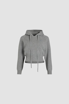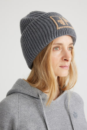 Bonnet en mélange de laine et cachemire éco-responsable gris tempête. Maille côtelée. JP en jacquard contrasté sur le devant.