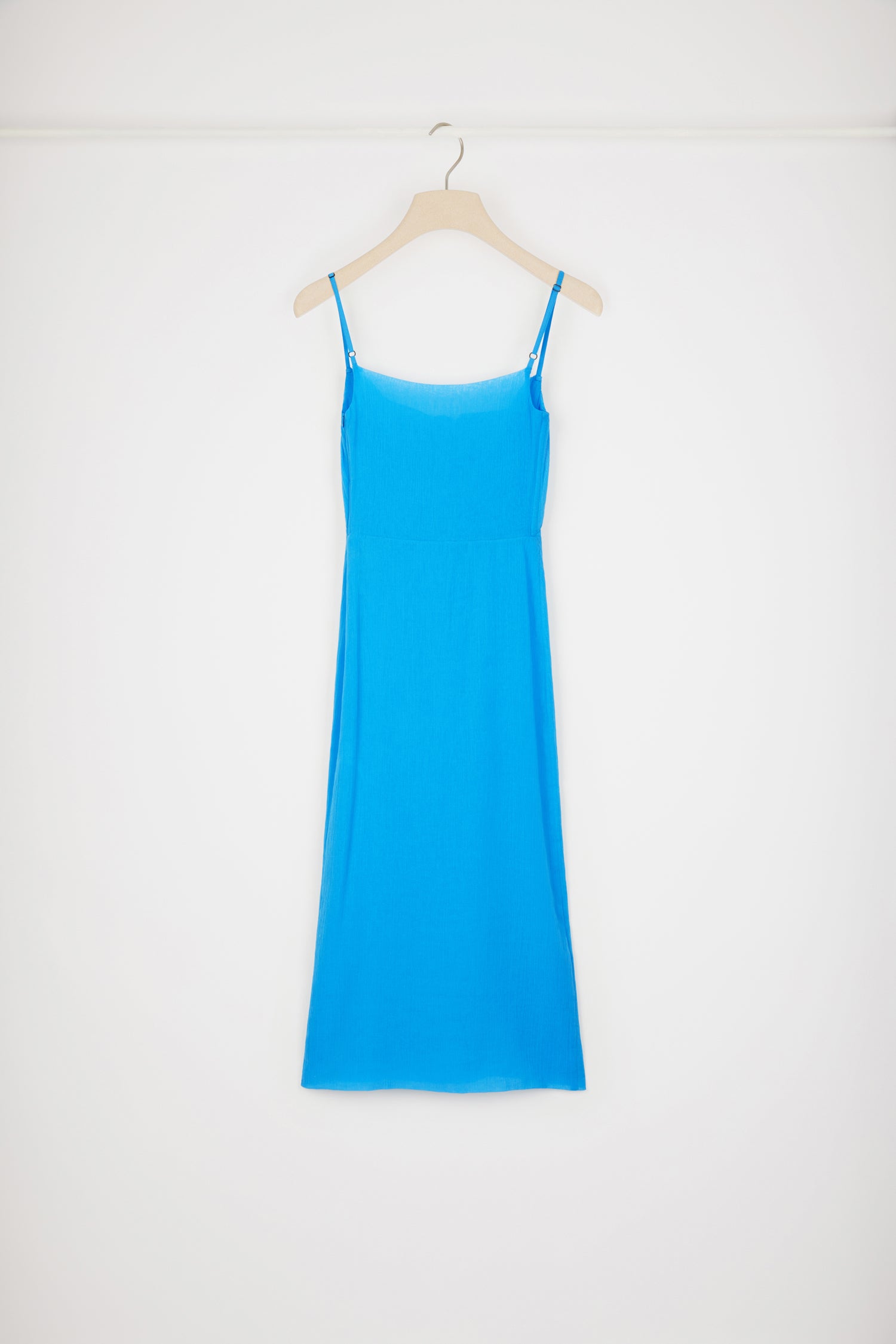 Robe en coton bio bleu joyau. Texture crêpe légèrement transparente. Silhouette ajustée. Longueur midi. Bretelles réglables esprit lingerie. Pans à nouer à la poitrine. Corsage ajusté avec détail de coutures.