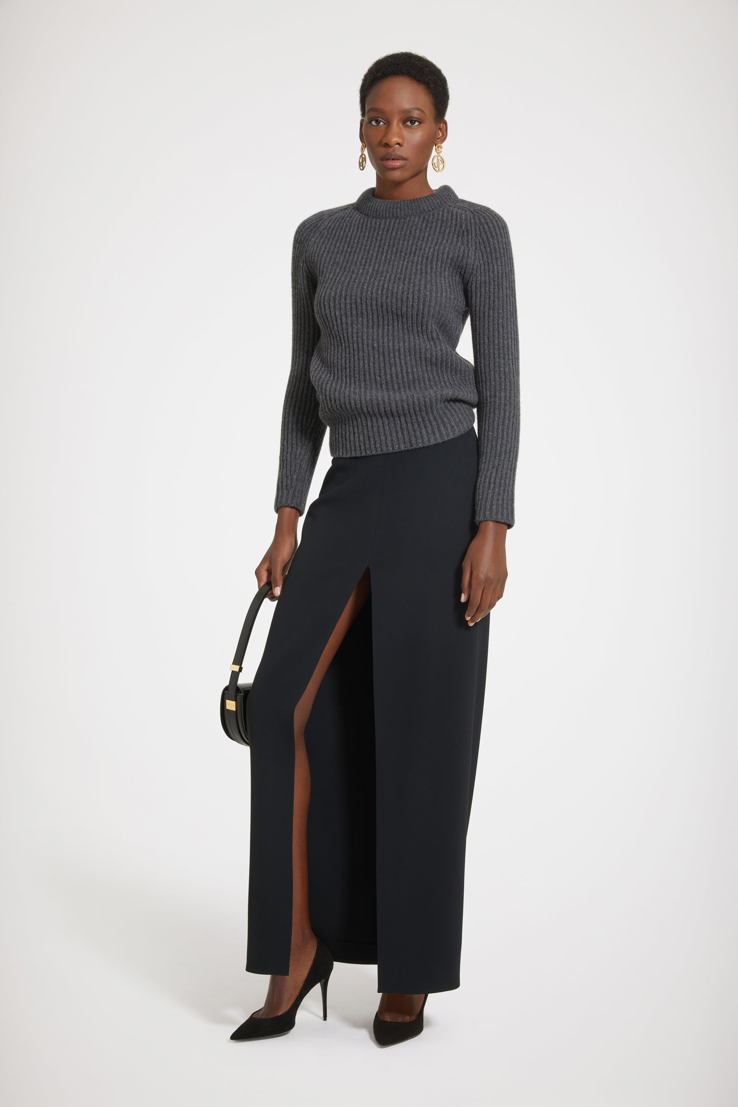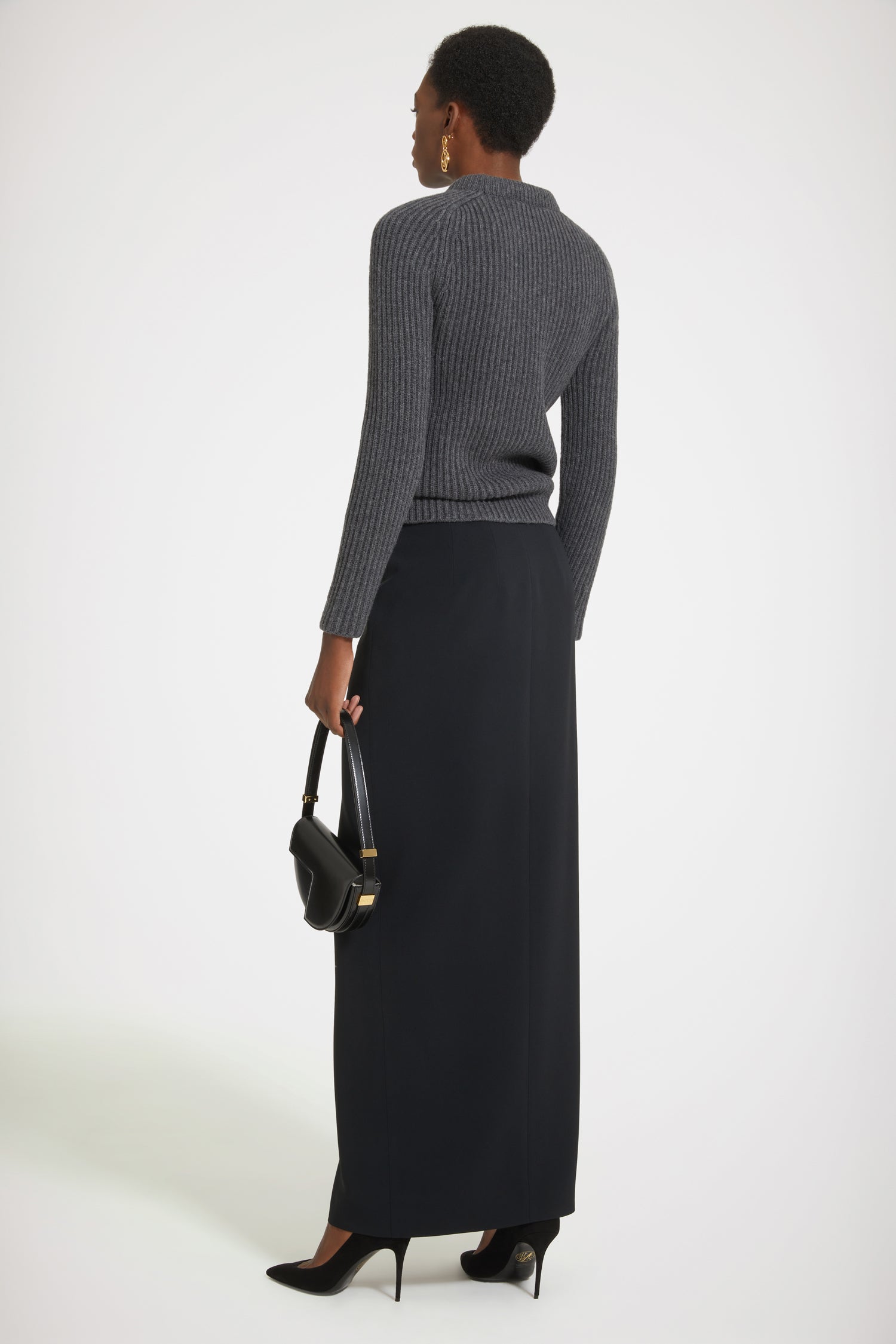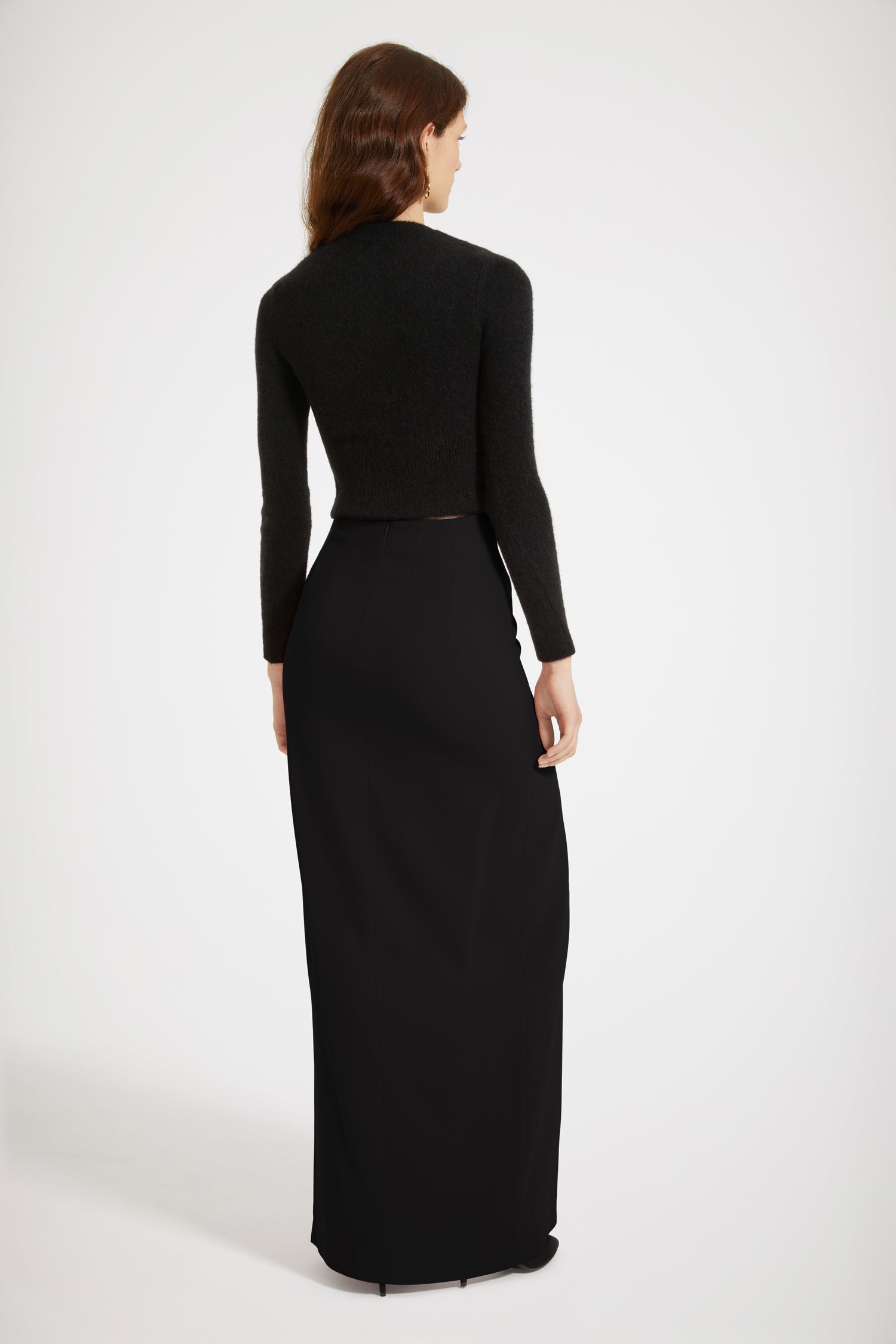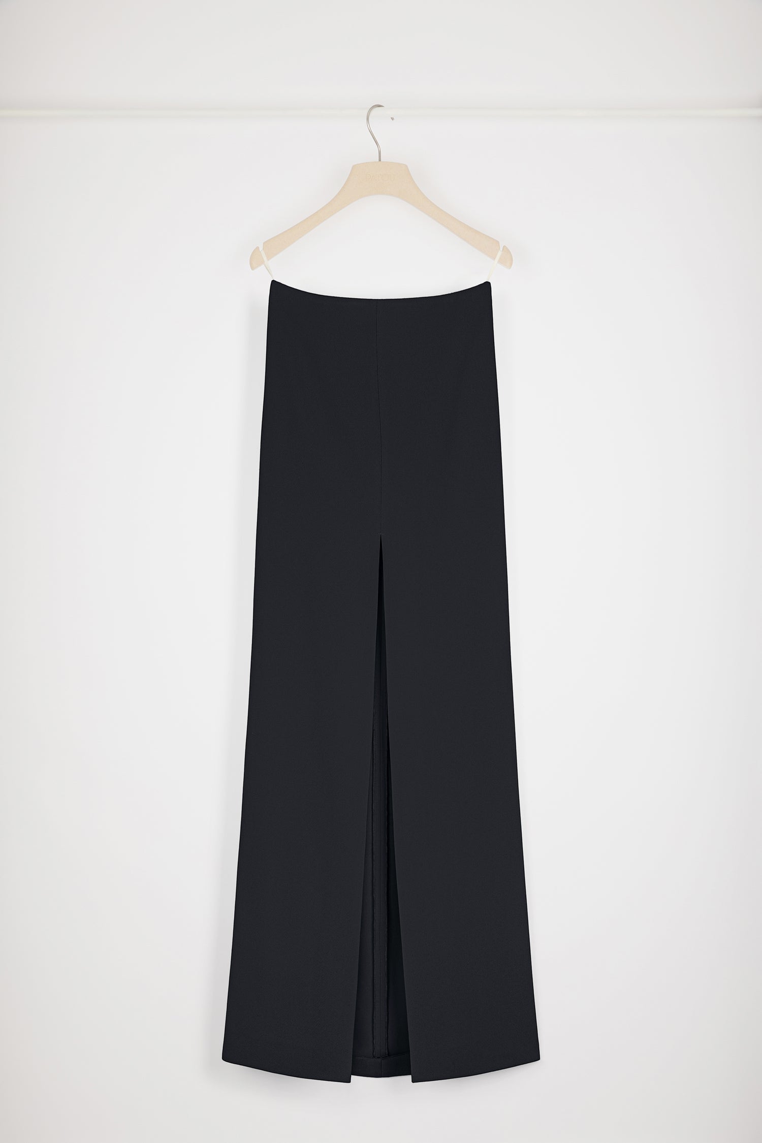 Jupe en crêpe technique noir. Modèle long. Silhouette ajustée avec pinces au dos. Fente haute sur le devant. Zip au dos. Modèle doublé.