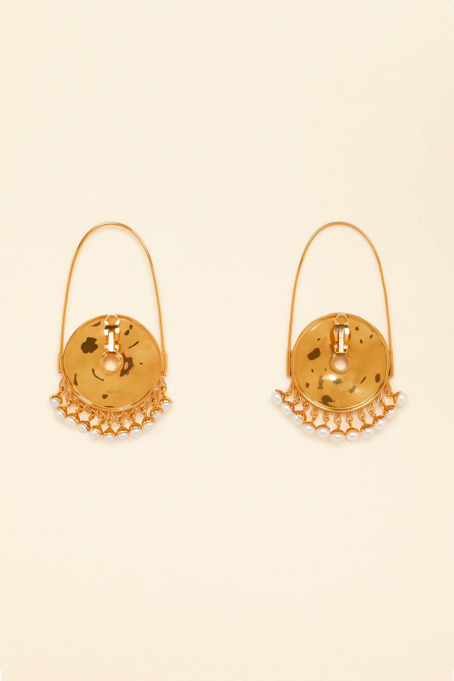 Boucles d'oreilles en laiton doré à l'or fin et perles. Sphère en laiton martelé au centre bordée de perles. Modèle clip.