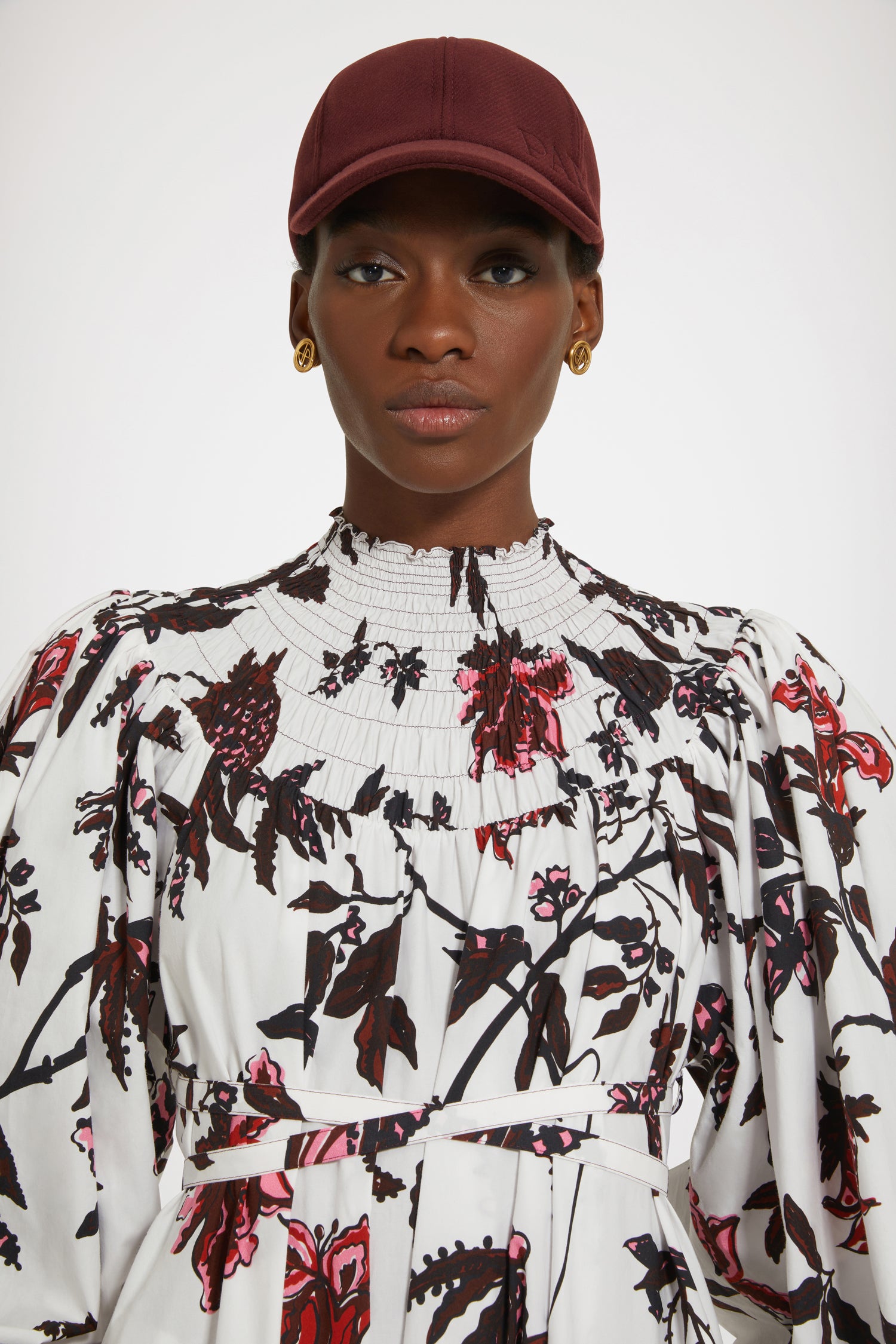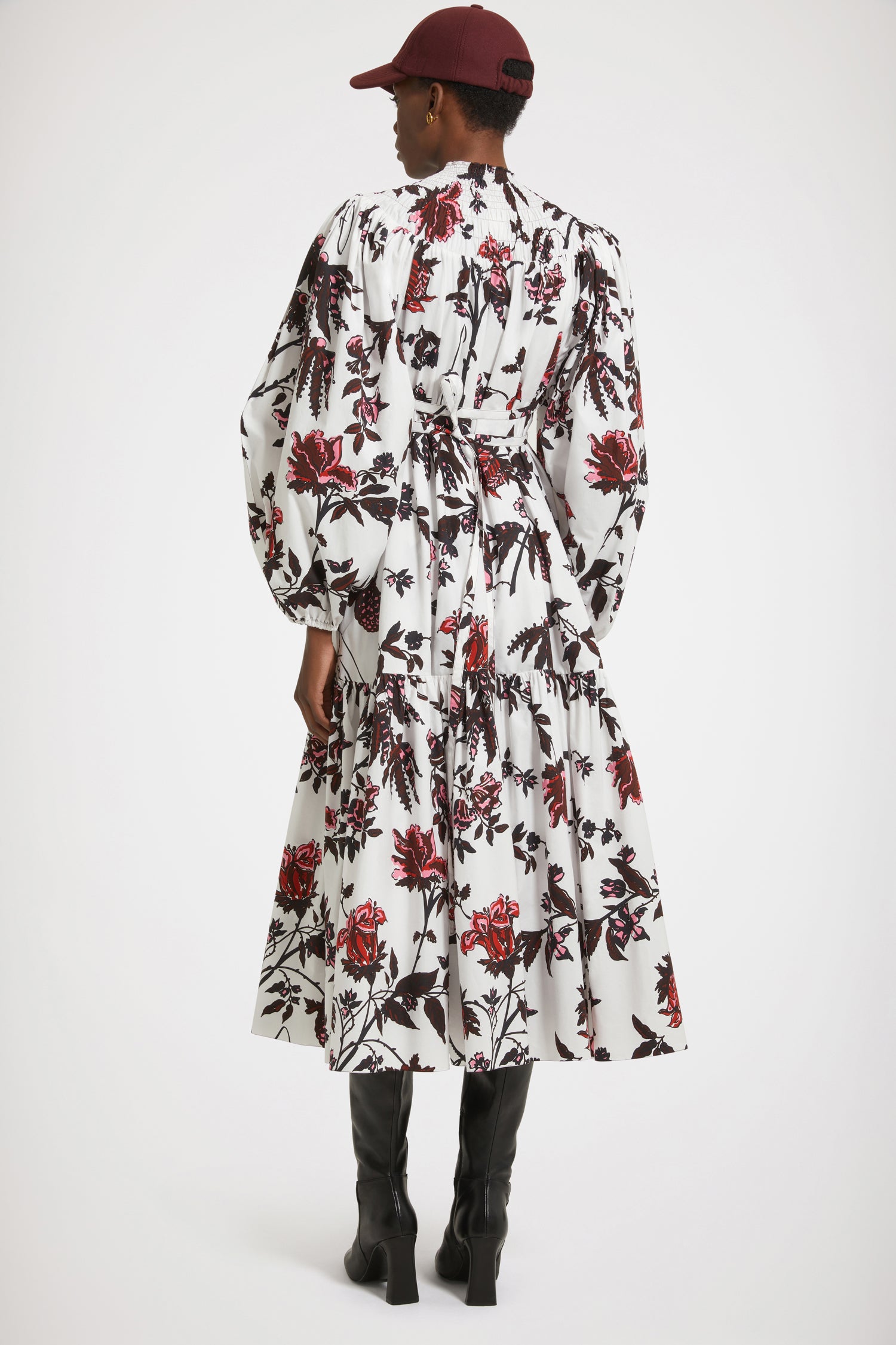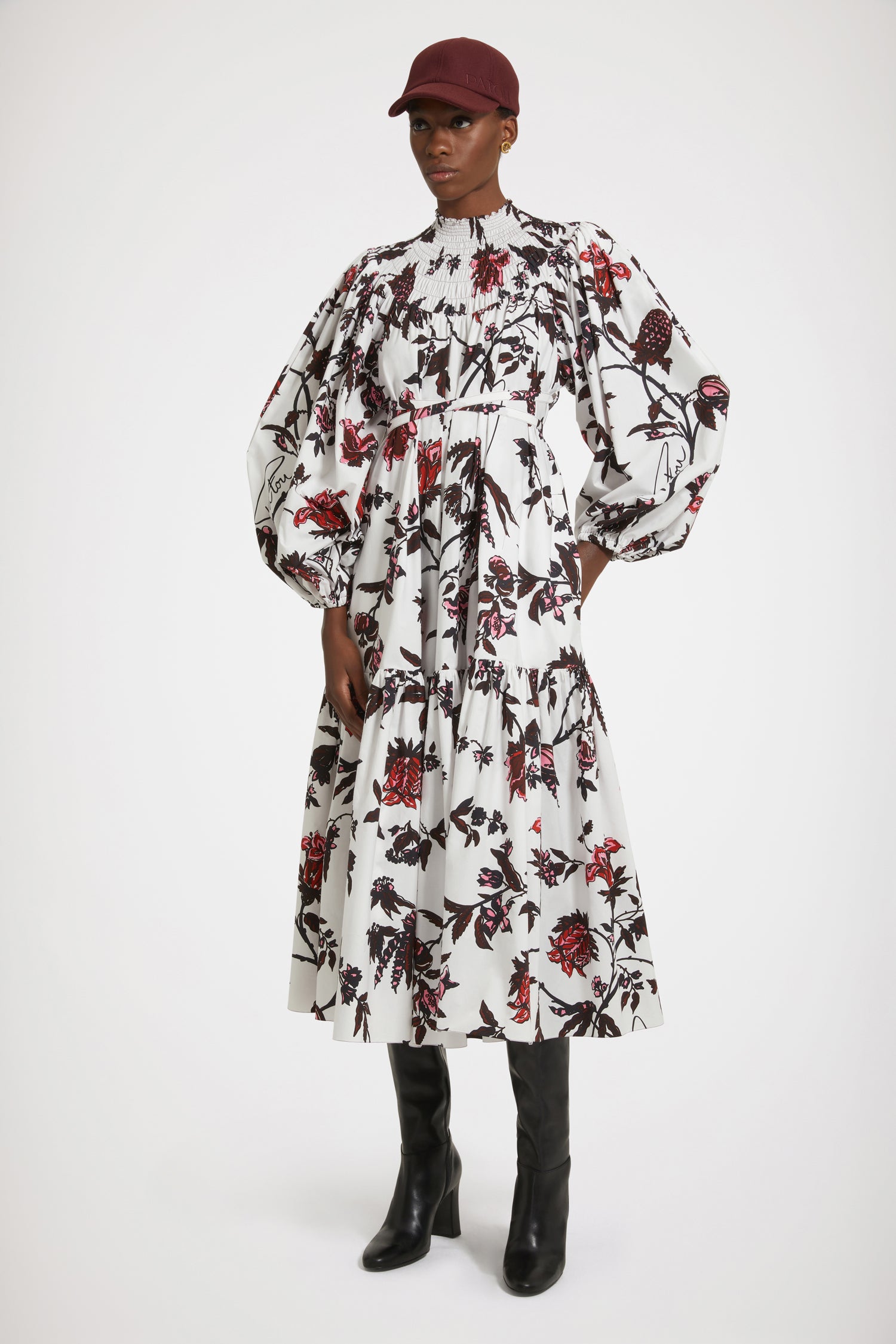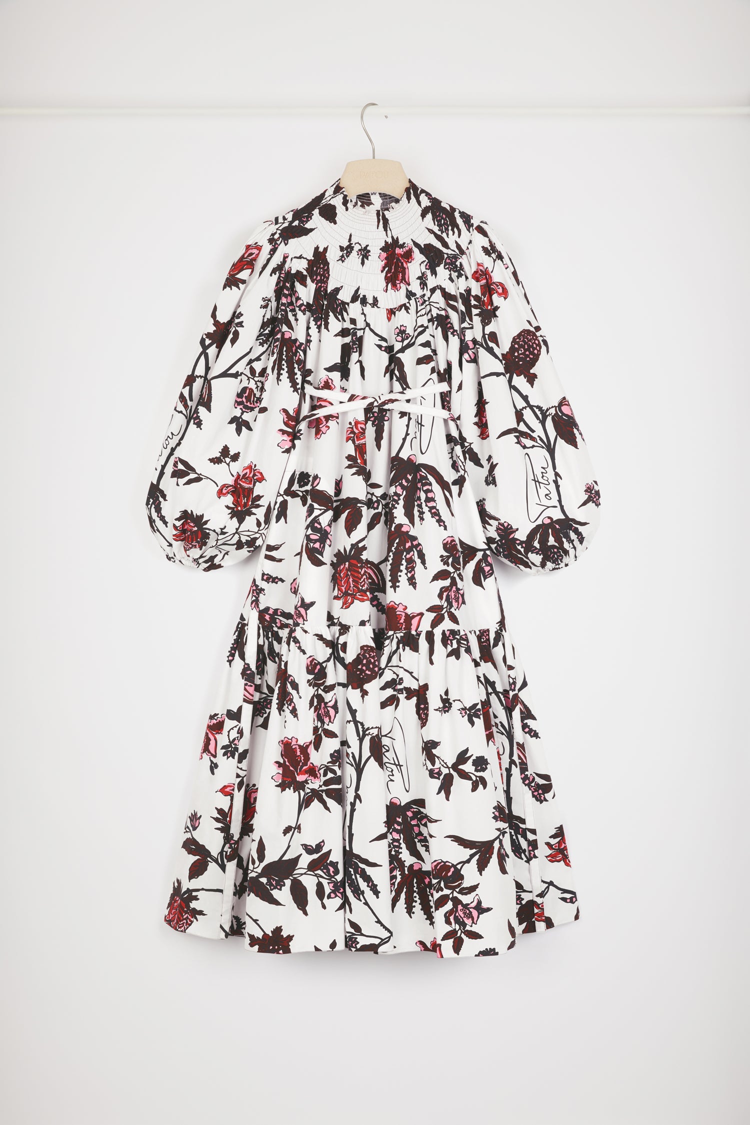 Robe en popeline de coton bio. Motif fleuri Hiver Indien. Modèle long. Col montant avec détail de smock. JP brodé au dos. Manches volumineuses à épaules bouffantes et poignets élastiqués. Ceinture amovible à la taille pouvant être nouée à l'avant ou à l'arrière. Jupe à volants.