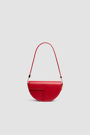 Sac à main en cuir lisse rouge élixir. Forme demi-lune avec découpes géométriques inspirée du monogramme JP. Pièce en métal doré avec détail JP sur le côté. Bandoulière ajustable permettant un porté épaule, en bandoulière ou à la main. Fermeture aimantée avec détail JP doré. Compartiments multiples à l’intérieur.