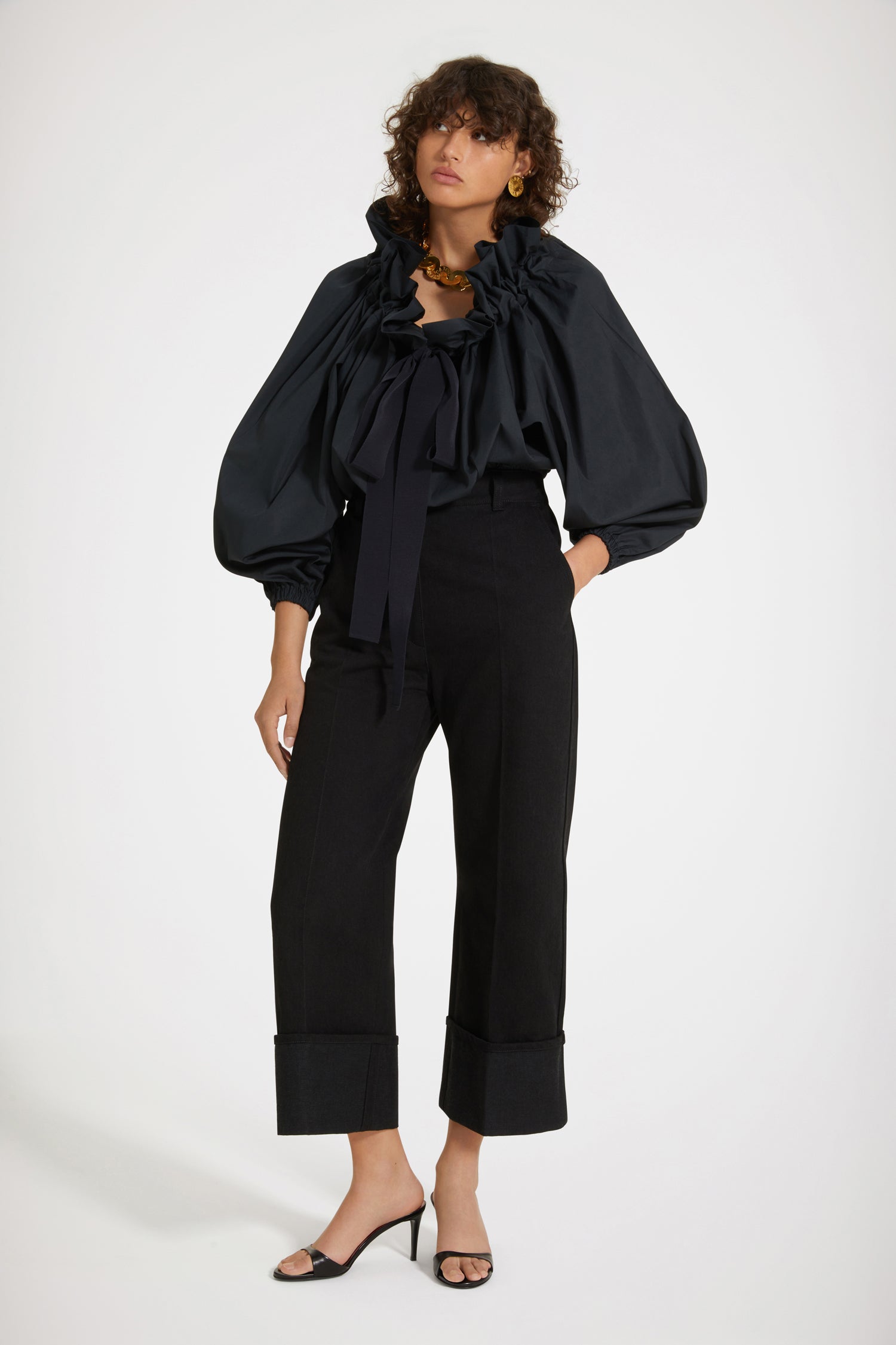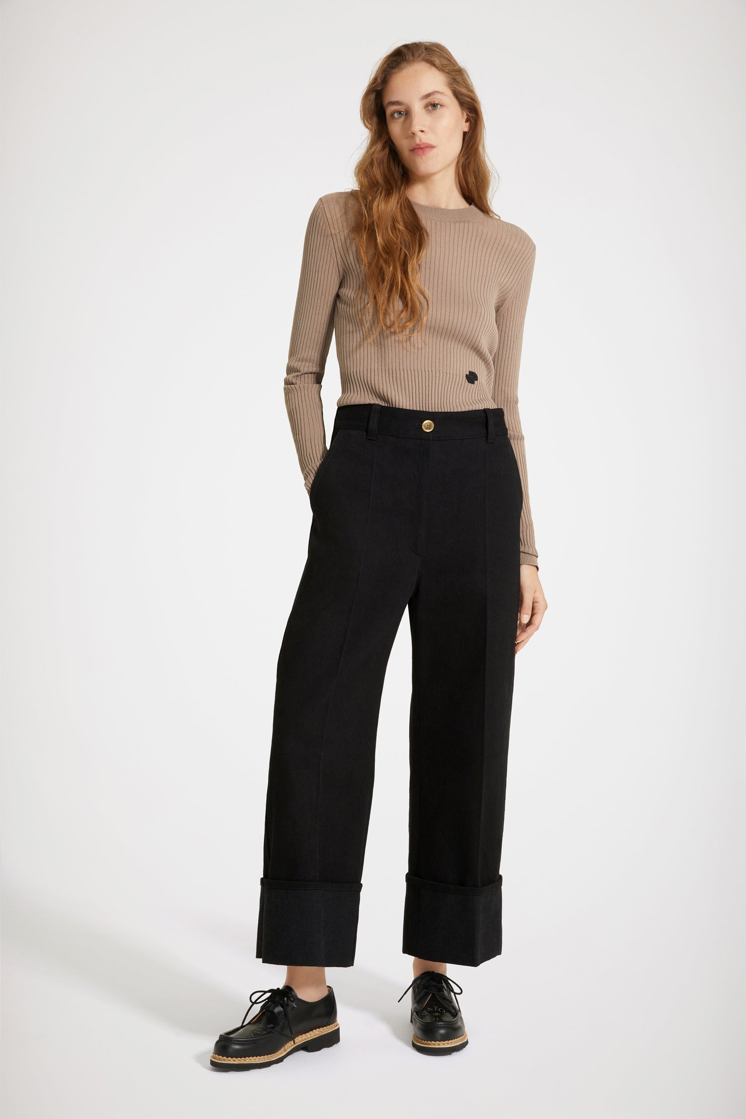 Pantalon en denim bio noir. Modèle iconique à jambe droite. Surpiqûres en contraste. Fermeture par bouton doré gravé JP et glissière à l’avant. Passants de ceinture à l’avant et poches latérales. Pinces à l'arrière. Revers exagéré.