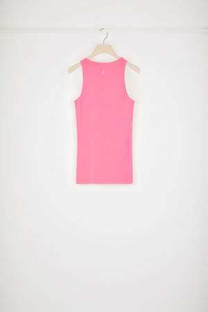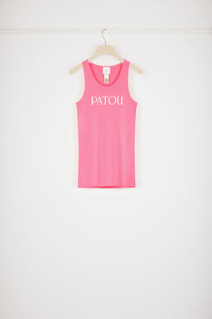 Débardeur près du corps en coton bio rose bégonia. Logo Patou sur le devant, monogramme JP à l’arrière.