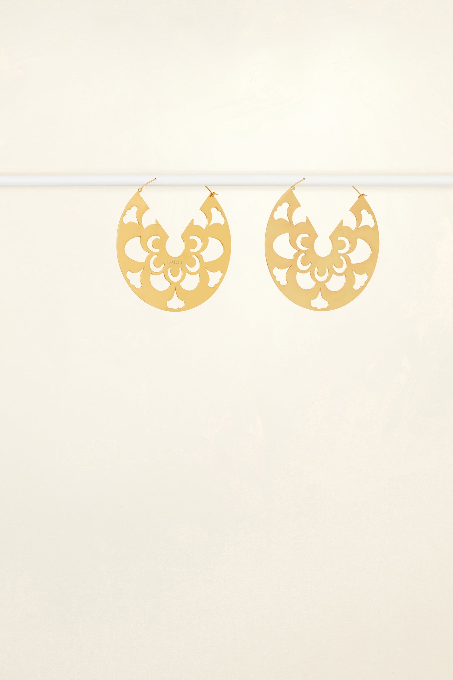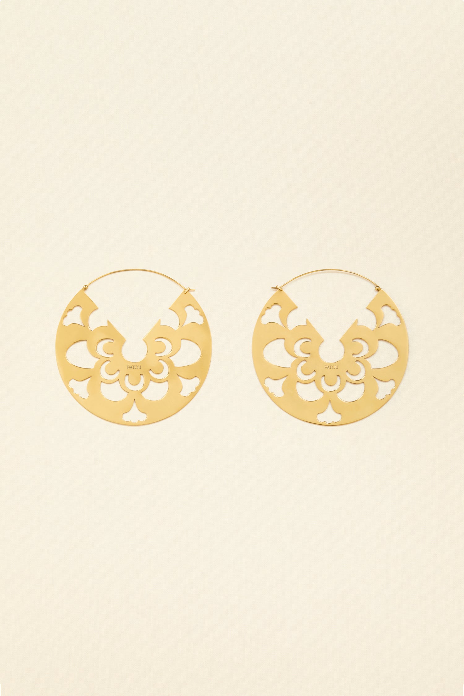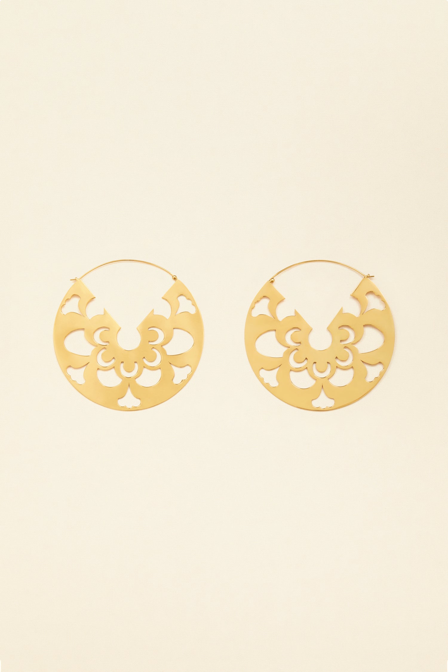 Grandes créoles en laiton doré à l’or fin. Découpes symétriques à l’inspiration florale.
