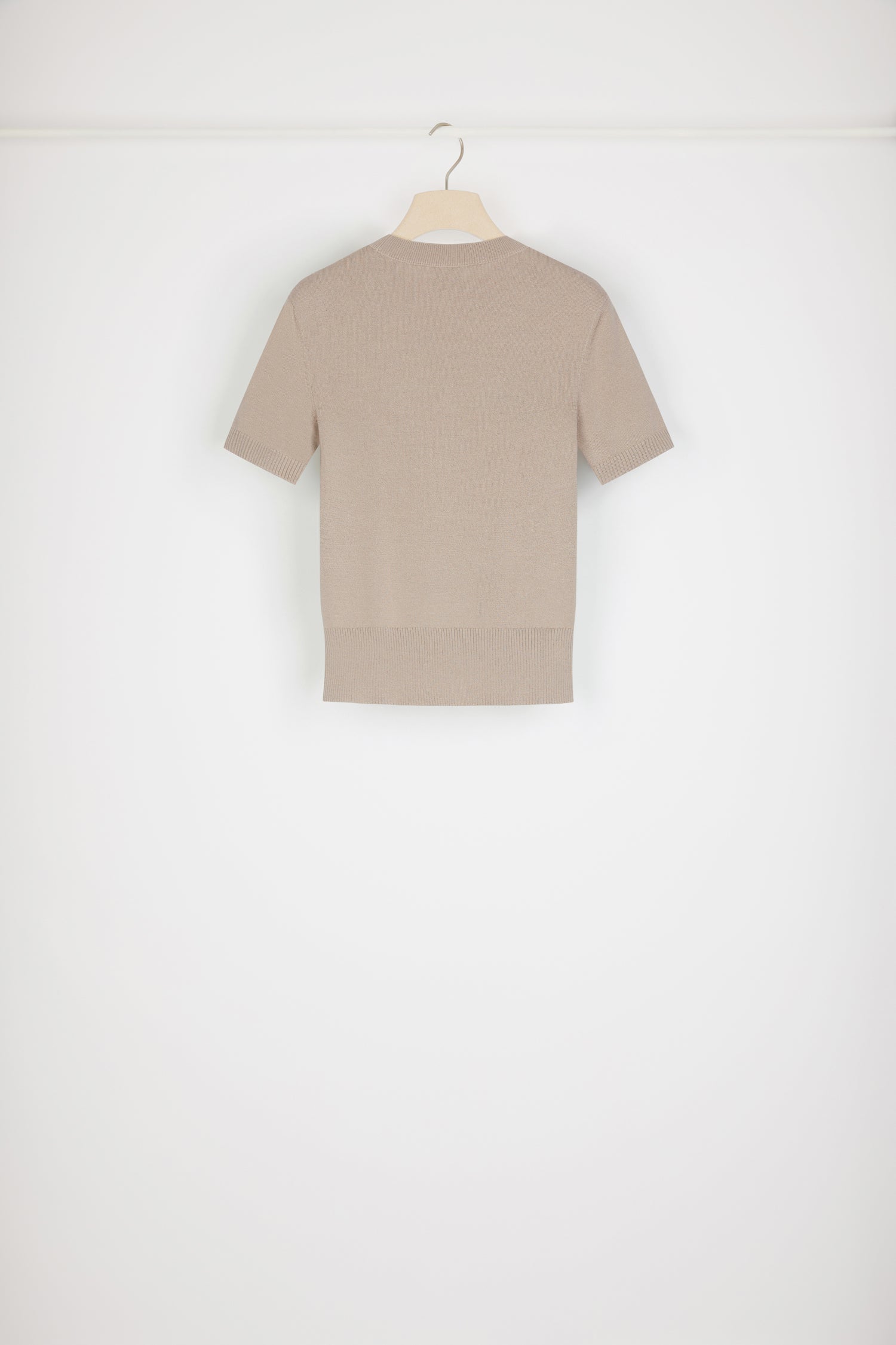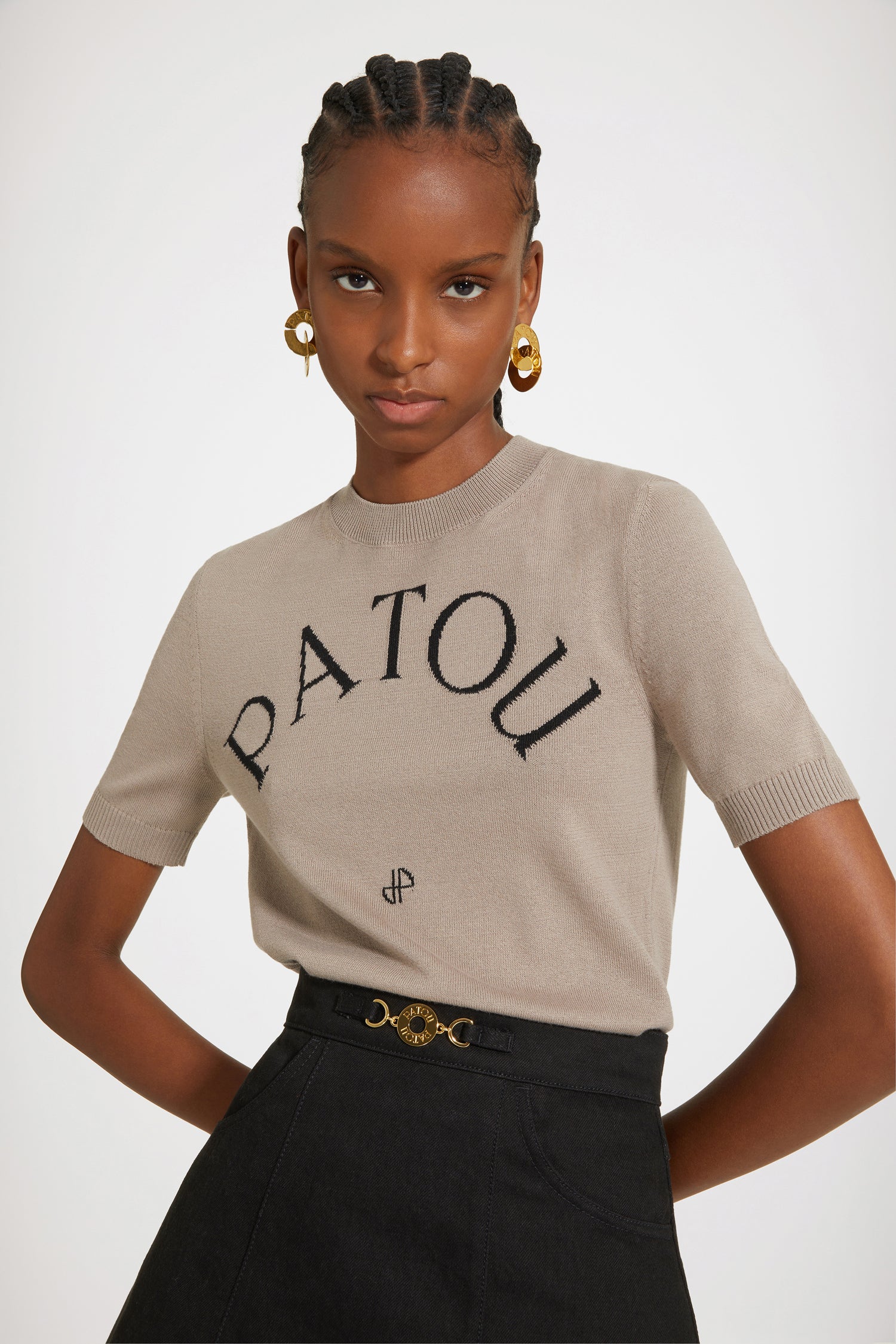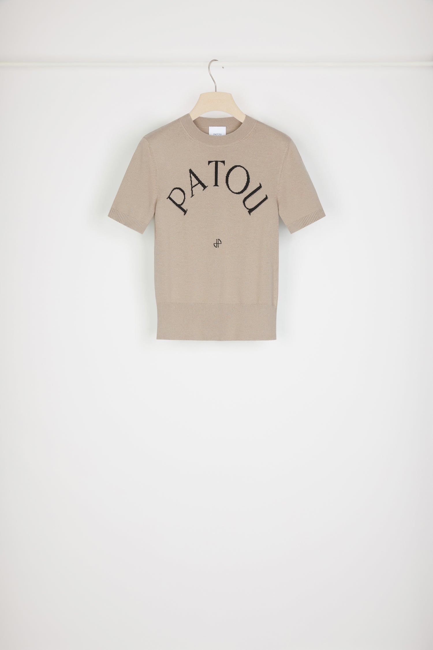 Top en maille de coton bio mélangé beige parchemin. Coupe ajustée, manches courtes. Col rond. Bords côtelés. Logo Patou et monogramme en jacquard à l’avant.