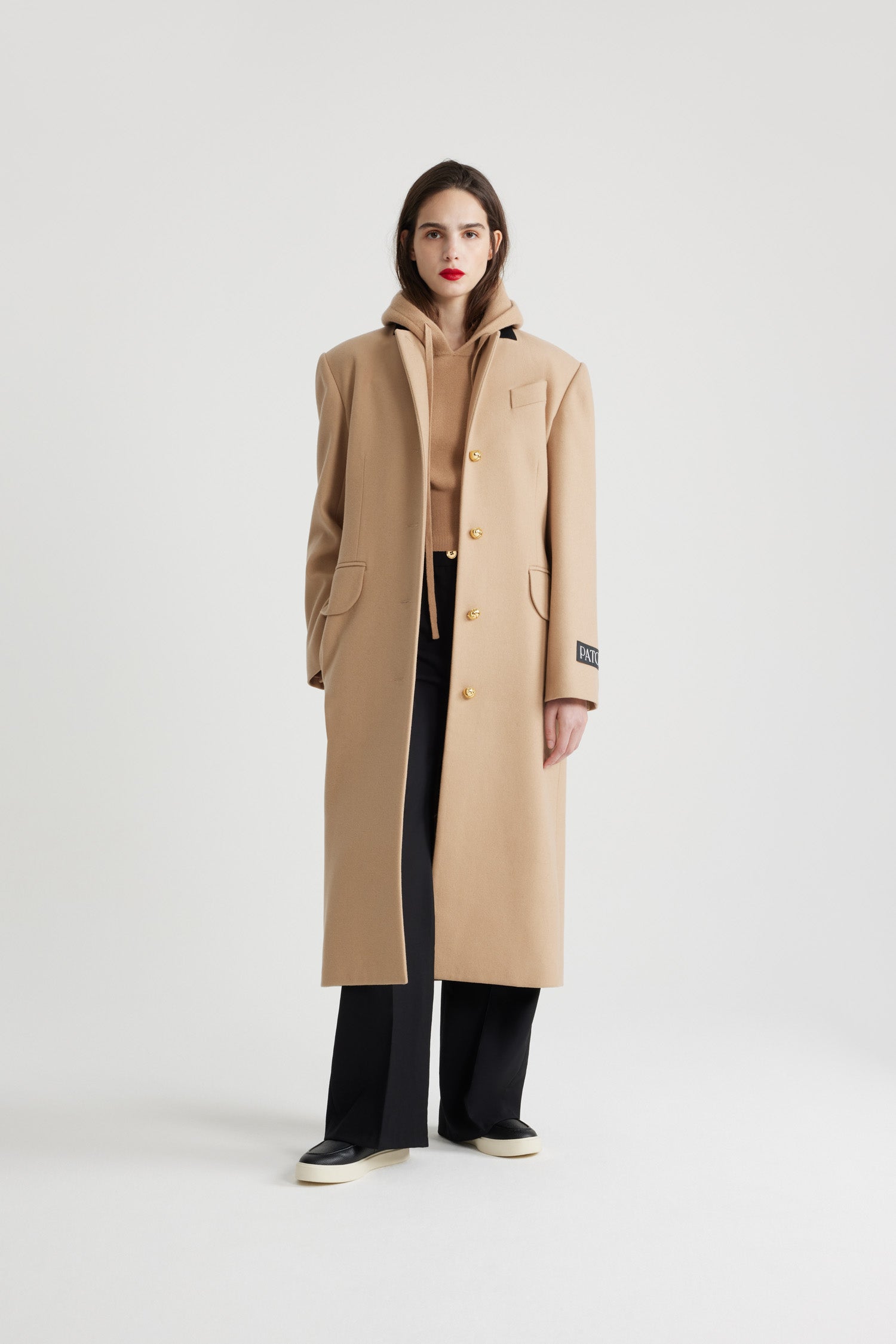 Manteau en mélange de laine et cachemire éco-responsable beige. Modèle long. Coupe droite. Épaules structurées. Col haut contrasté. Boutons boule dorés JP. Poche à la poitrine et poches à rabat. Ceinture à la taille. Poignets boutonnés. Étiquette Patou sur la manche gauche. Fente haute au dos. Modèle doublé.