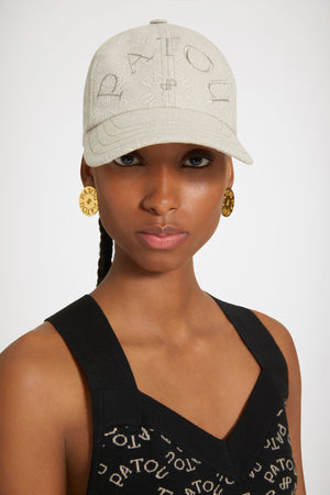 Casquette en jacquard de coton bio. Motif Médaillon composé de logos Patou et monogrammes JP. Patou et monogramme JP gris brodés à l'avant. Élastique à l'arrière. Modèle unisexe. Disponibile en deux tailles.