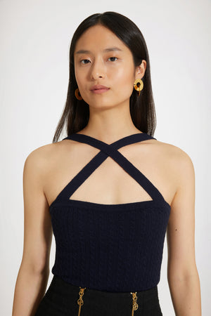 Haut en laine et cachemire noir éclipse. Maille torsadée. Bretelles croisées sur le devant. Décolleté coeur. Monogramme JP au dos. Taille côtelée.