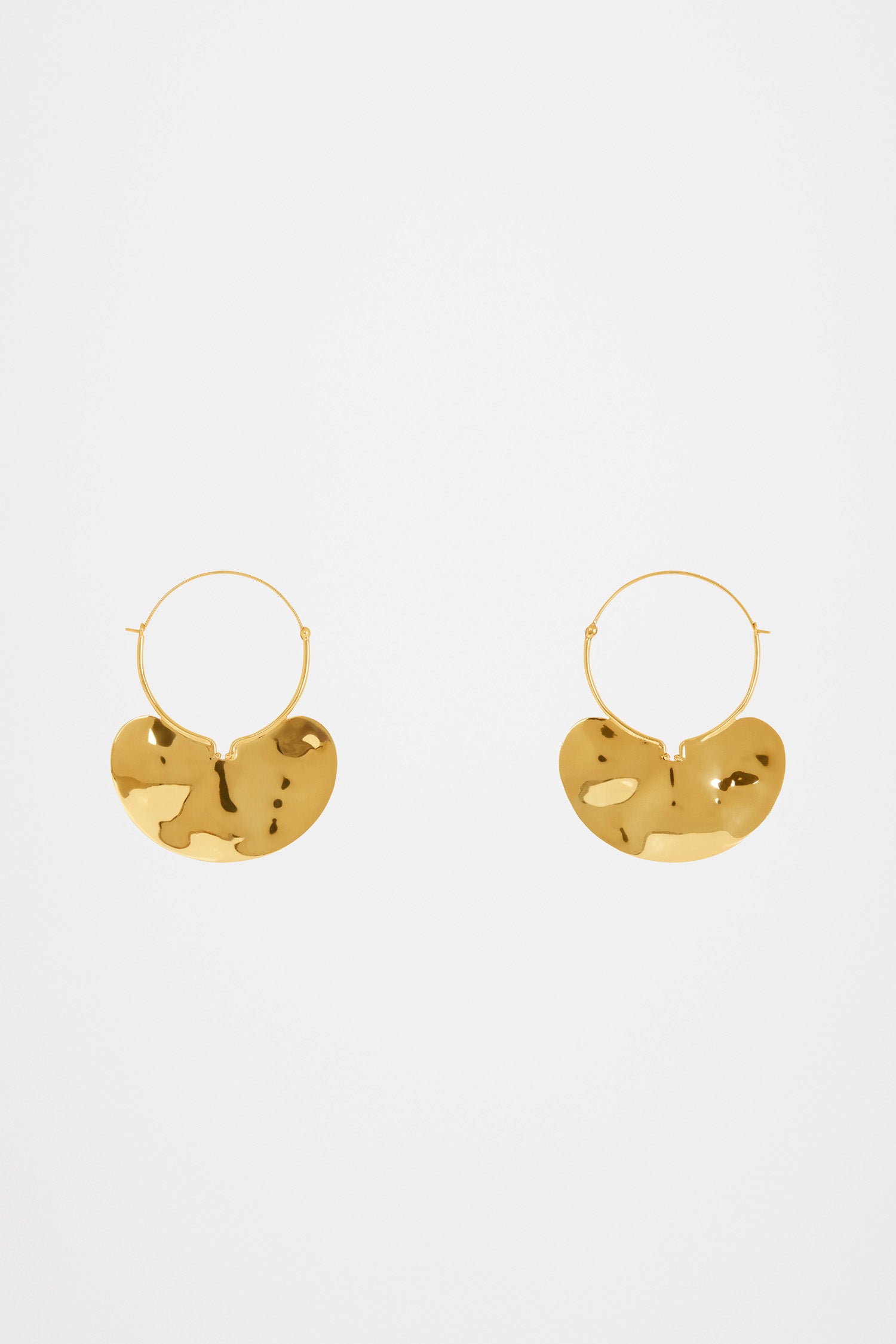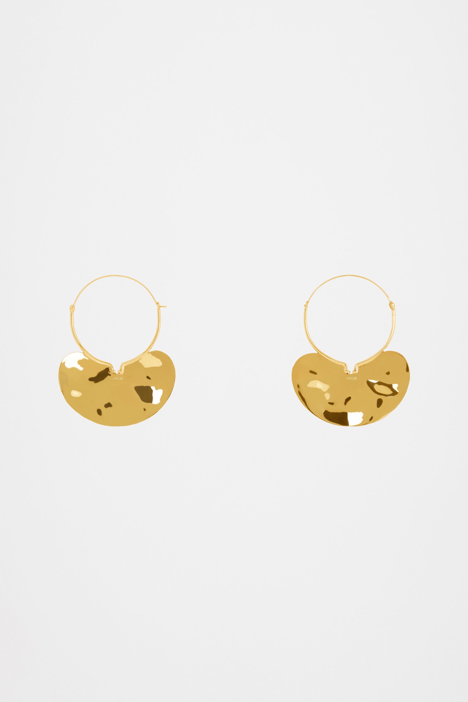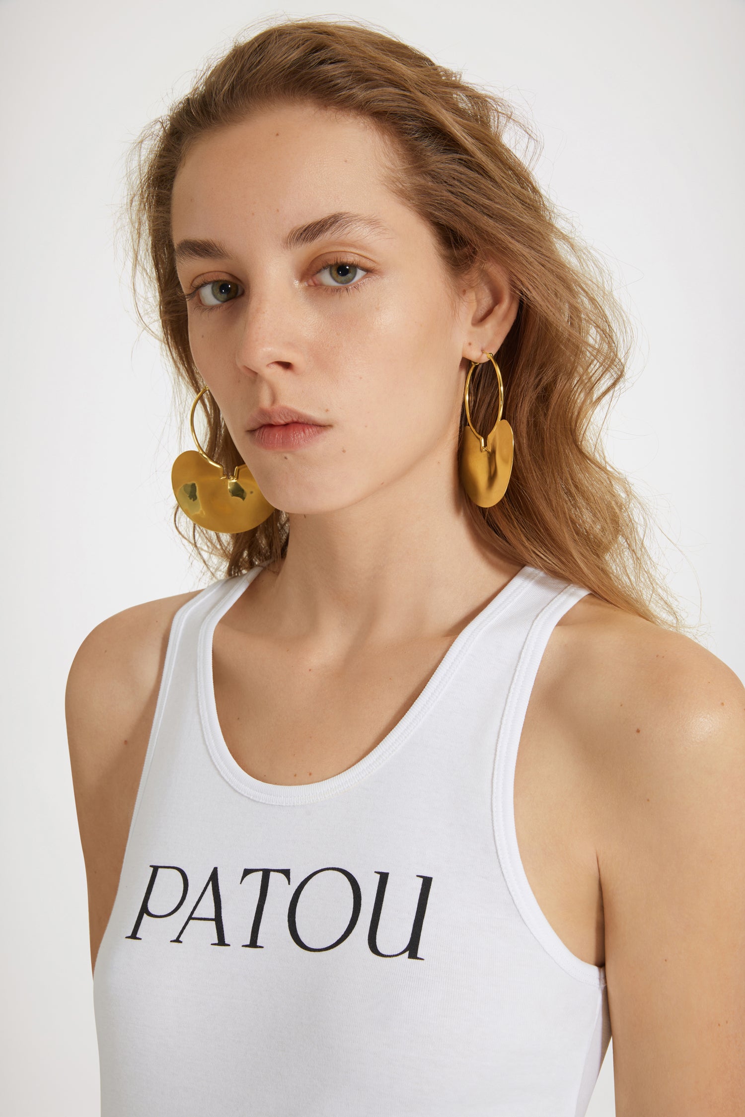 Orecchini a cerchio in ottono dorato con oro fine. Targa martellata incisa Patou.