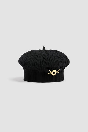 Basco in lana e cashmere nero. Maglia a trecce. Bordo lavorato a costine. Decorazione con logo medaglione Patou oro inciso sul davanti.