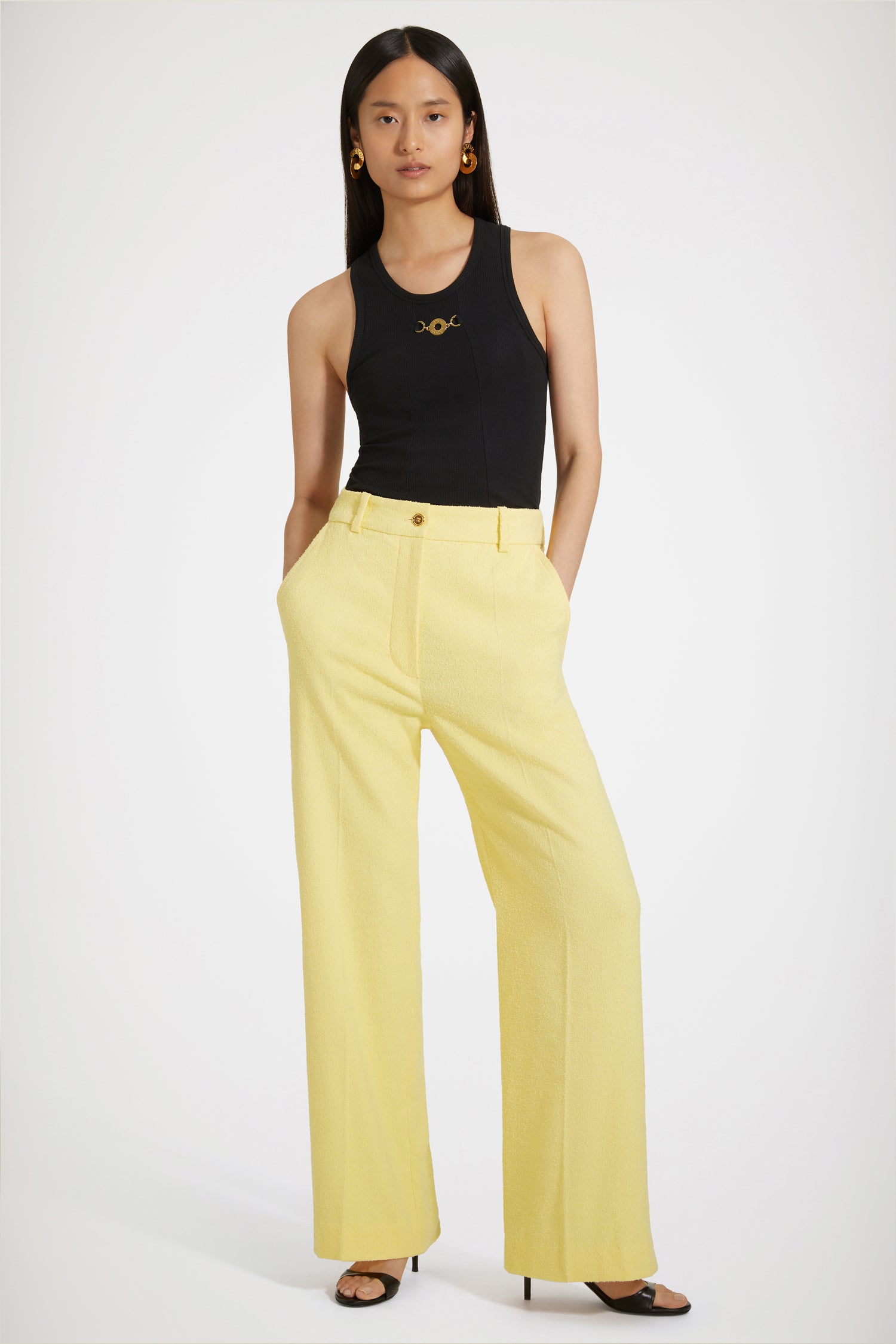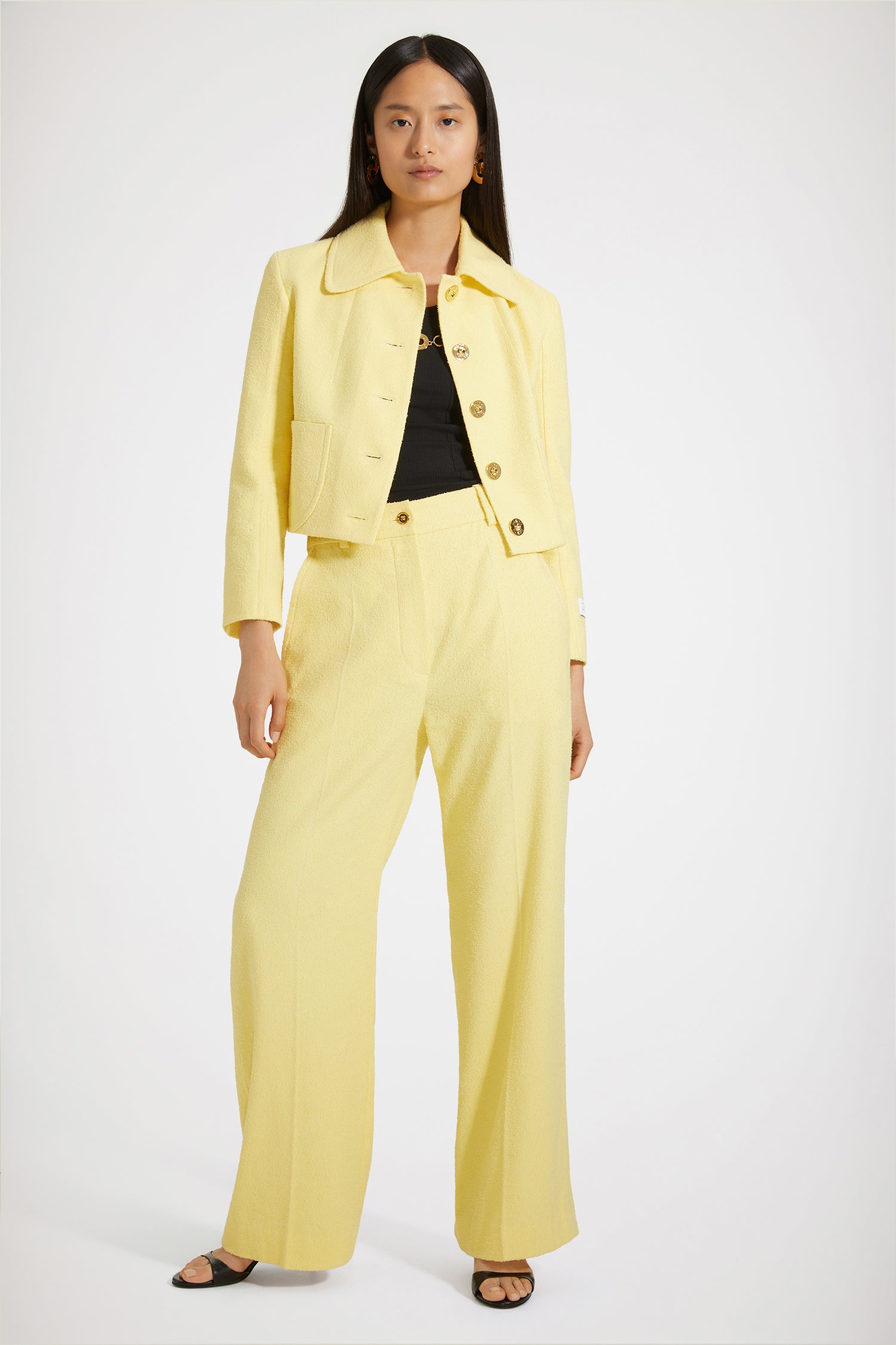 Pantalone in tweed di misto cotone giallo mimosa. Modello iconico. Gamba dritta. Chiusura con bottone oro inciso JP e zip. Passanti per cinture e tasche laterali. Pinces signature sul retro.
