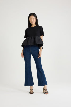 Maglietta in cotone bio nero. Jersey pesante. Modello ibrido con orlo a balza in faglia. Collo tondo. Monogramma JP calligrafia ricamato sul petto. Arricciatura in vita.