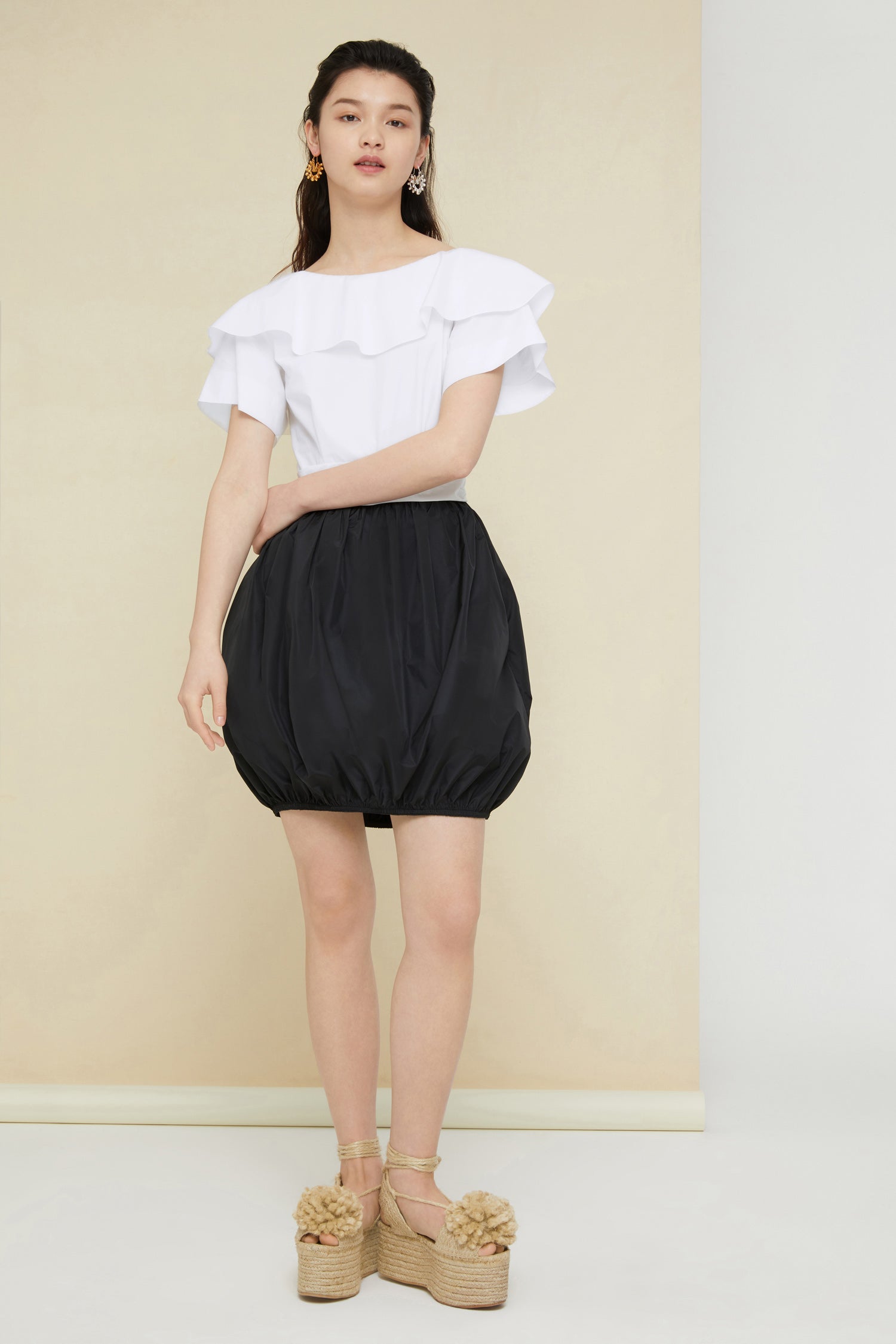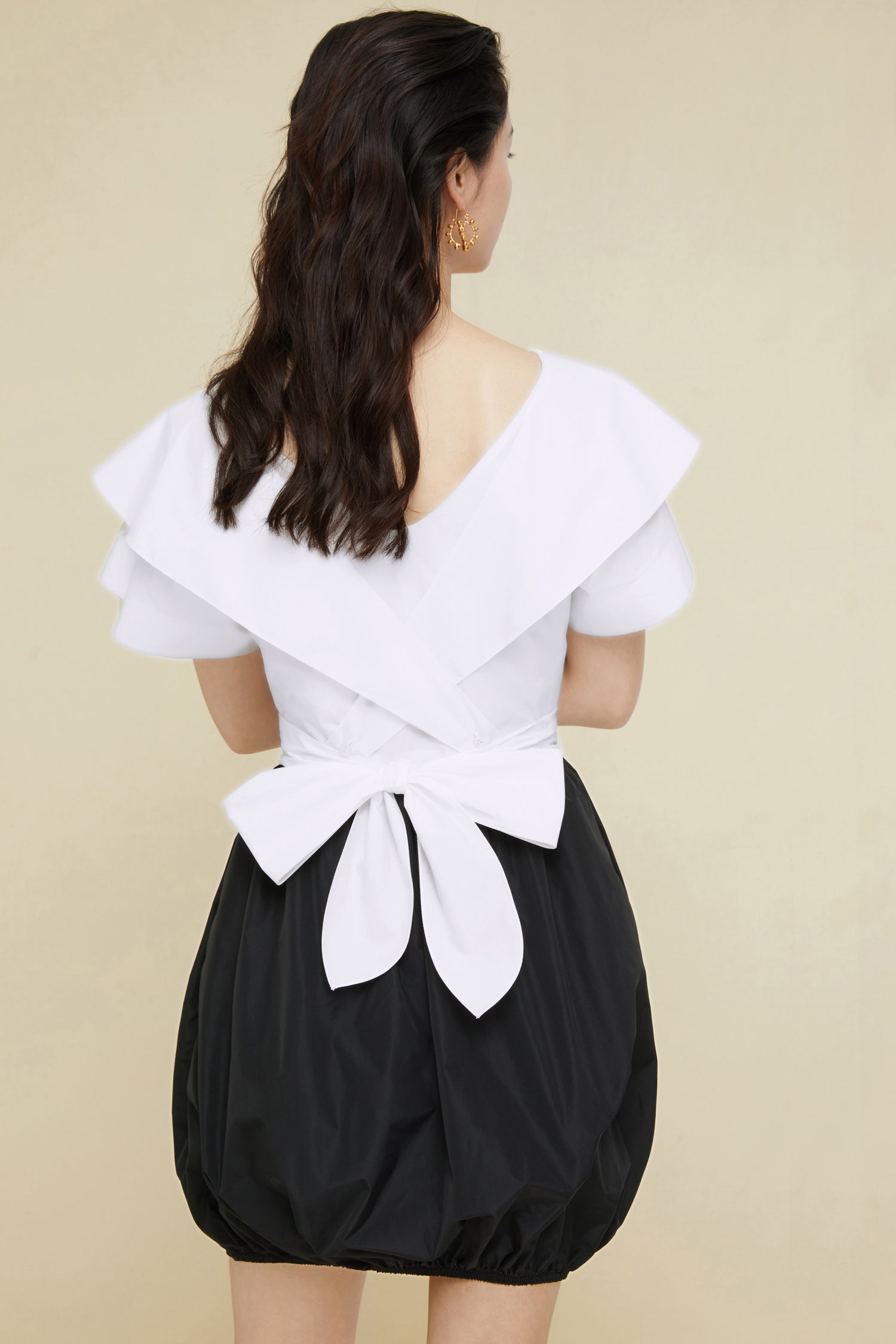 Vestito in popeline di cotone bianco e faille eco-sostenibile nero. Scollo tondo con balza. Schiena incrociata con fasce da annodare. Gonna a palloncino con orlo elasticizzato. Cerniera nascosta sul lato.