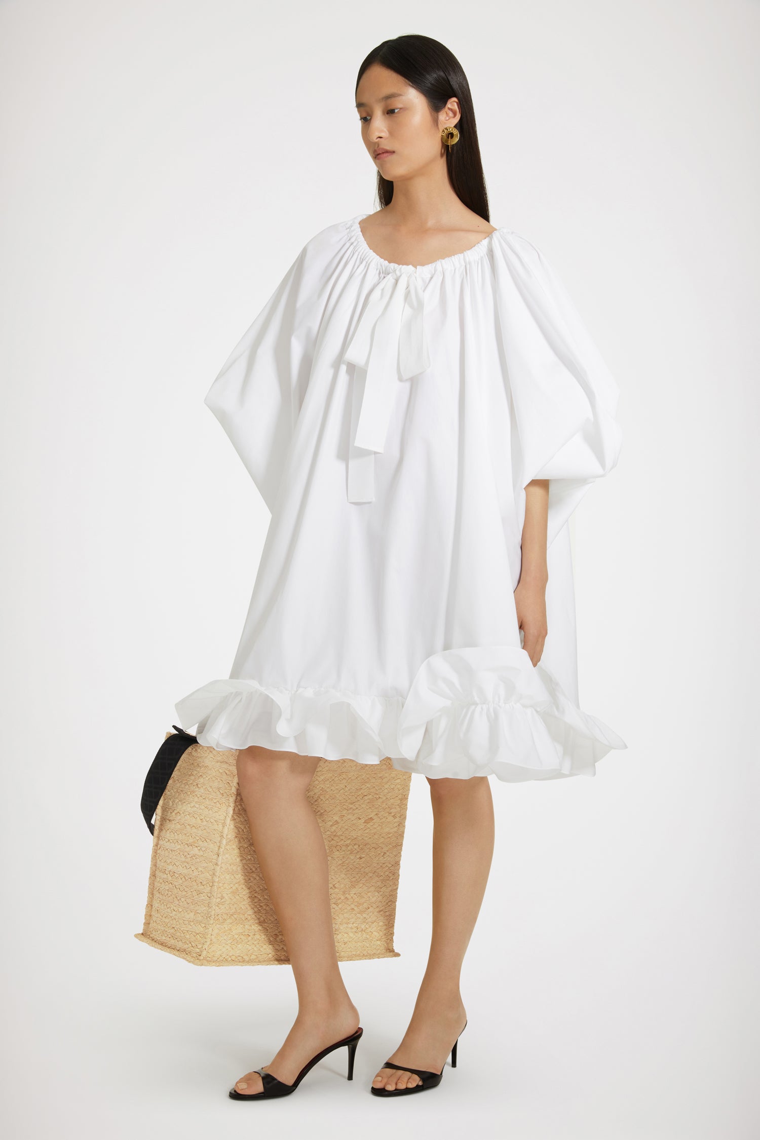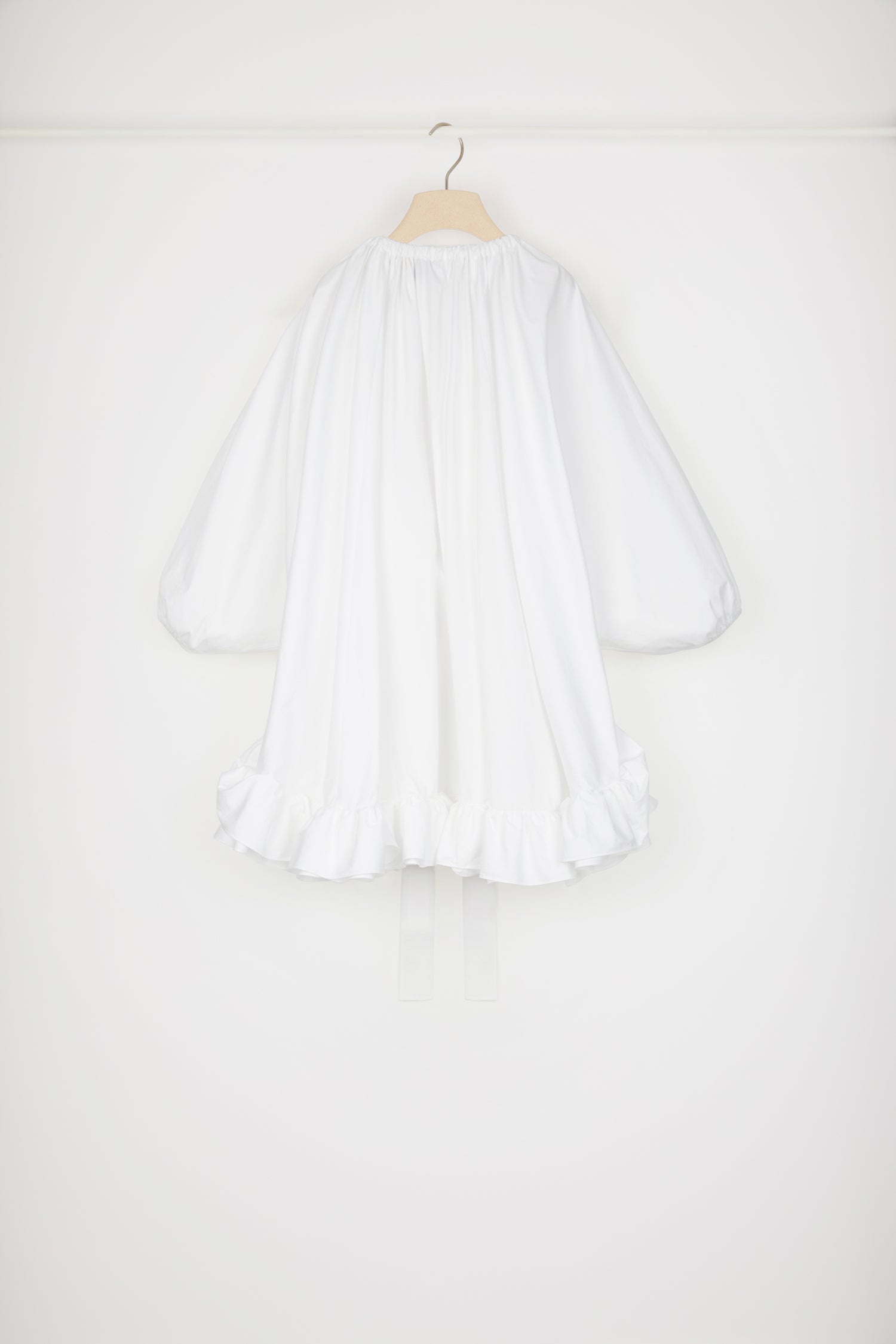 Vestito in cotone bio bianco. Collo elasticizzato con coulisse in grosgrain che può scoprire le spalle. Maniche a palloncino con polsini elasticizzati. Doppia balza sull'orlo.