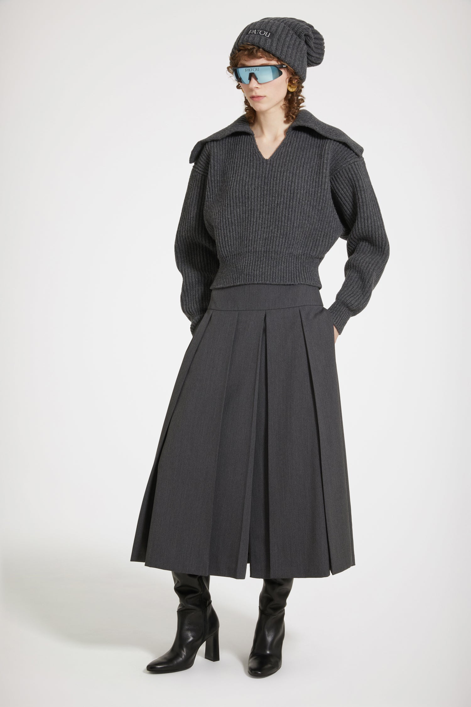 Gonna in lana tecnica grigio antracite. Lunghezza midi. Pieghe a cannoncino larghe. Tasche ai lati. Zip sul retro. Modello foderato.