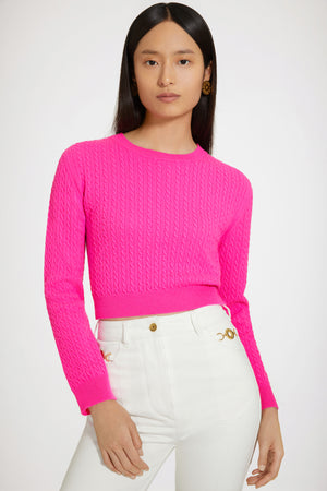 Maglia in lana e cachemire rosa begonia. Maglia a trecce. Collo tondo. Apertura sul retro con cintura da annodare in vita.