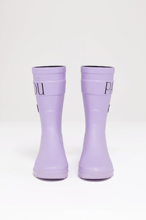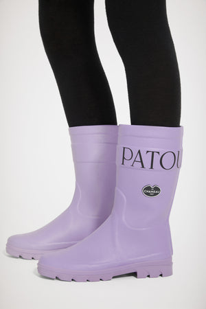 Stivali bassi in gomma color lavanda. Modello esclusivo nato da una collaborazione speciale con la maison francese Le Chameau, esperti riconosciuti di stivali. Impemeabile con interno traspirante. Loghi Patou e Le Chameau neri al lato. Punta tonda.
