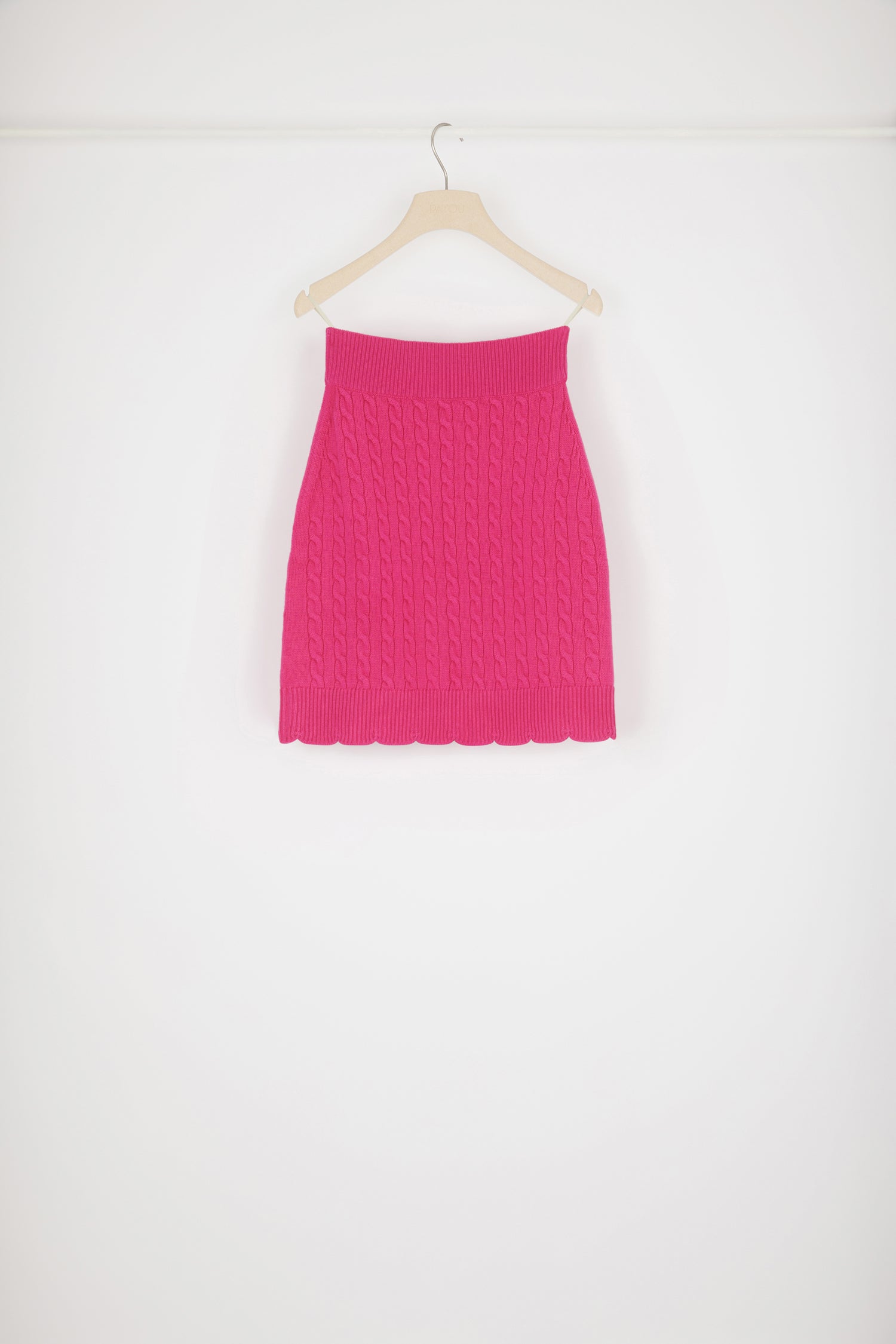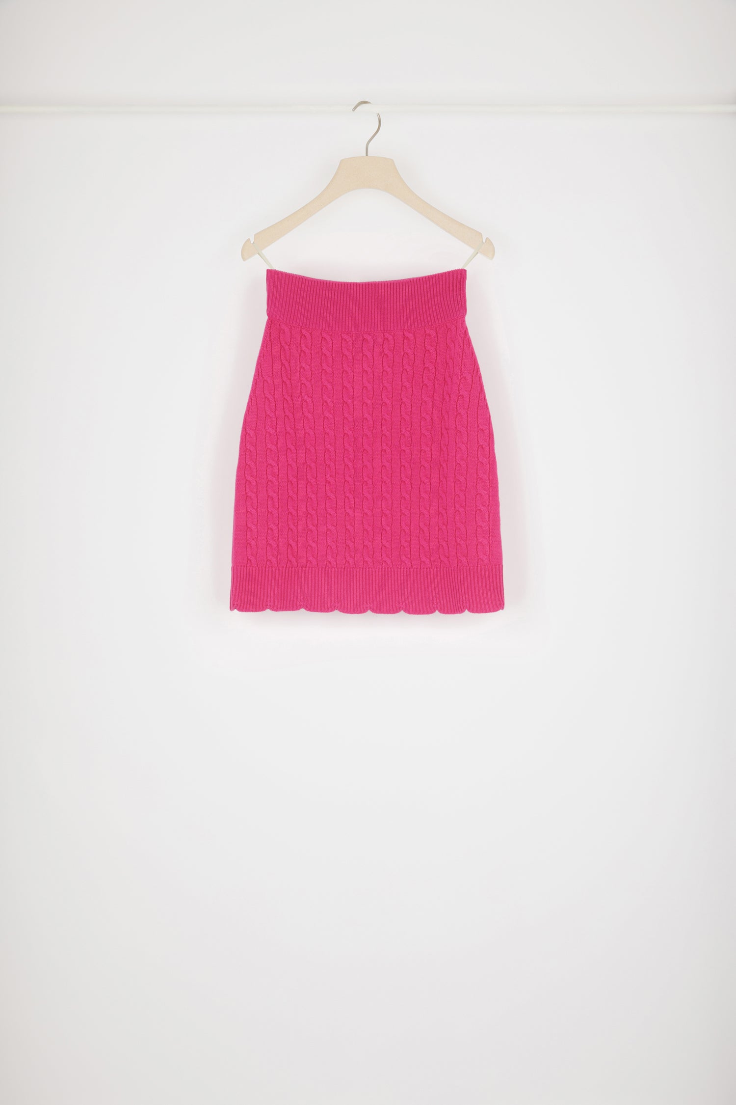 Gonna in lana merino fuchsia. Dettaglio di trecce. Vestibilità aderente. Vita alta. Orlo a scaloppina.