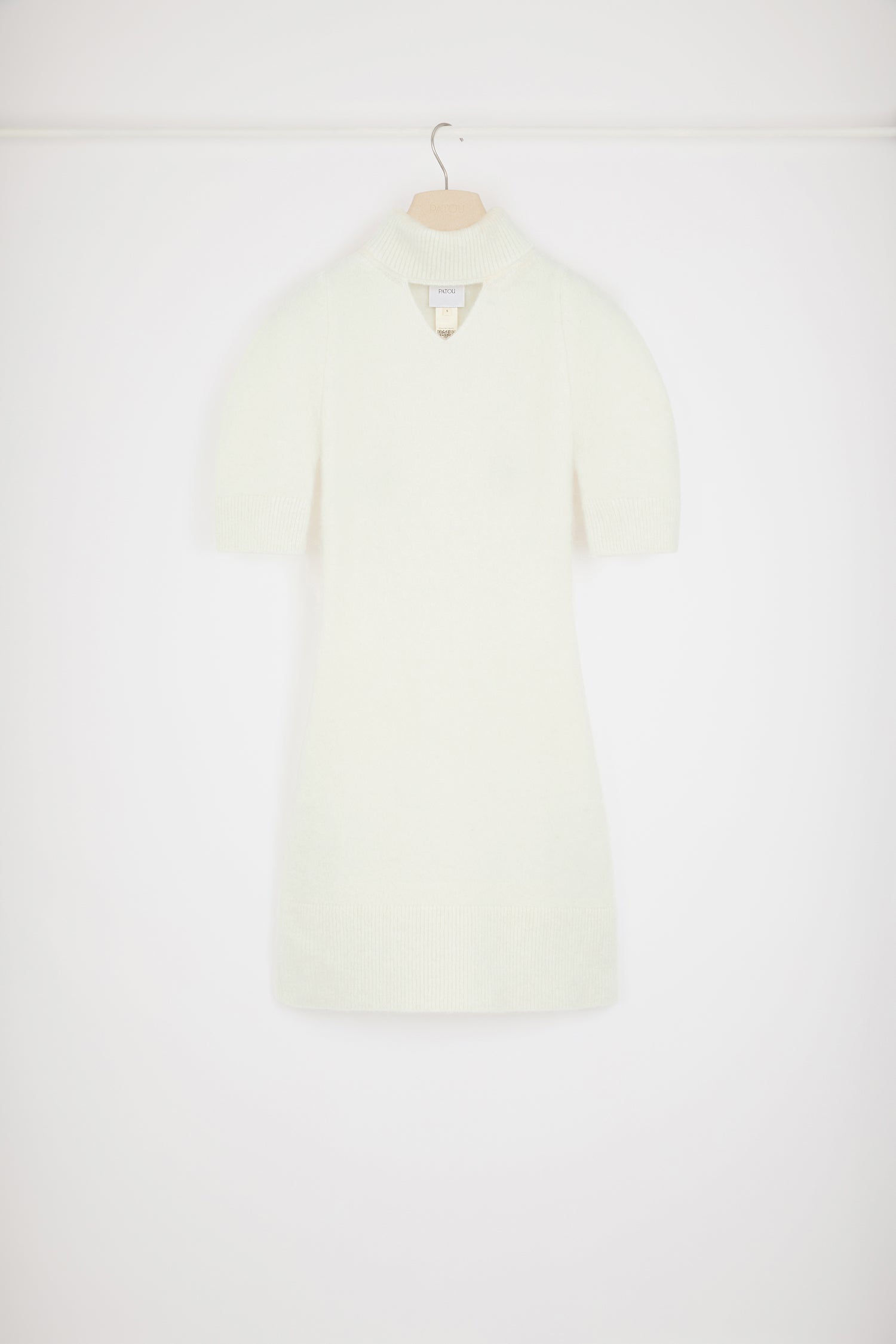 Vestito in misto alpaca sostenibile bianco neve. Modello corto. Vestibilità aderente. Collo dolcevita con apertura sul davanti. Bordi a costine. Spalle a sbuffo.
