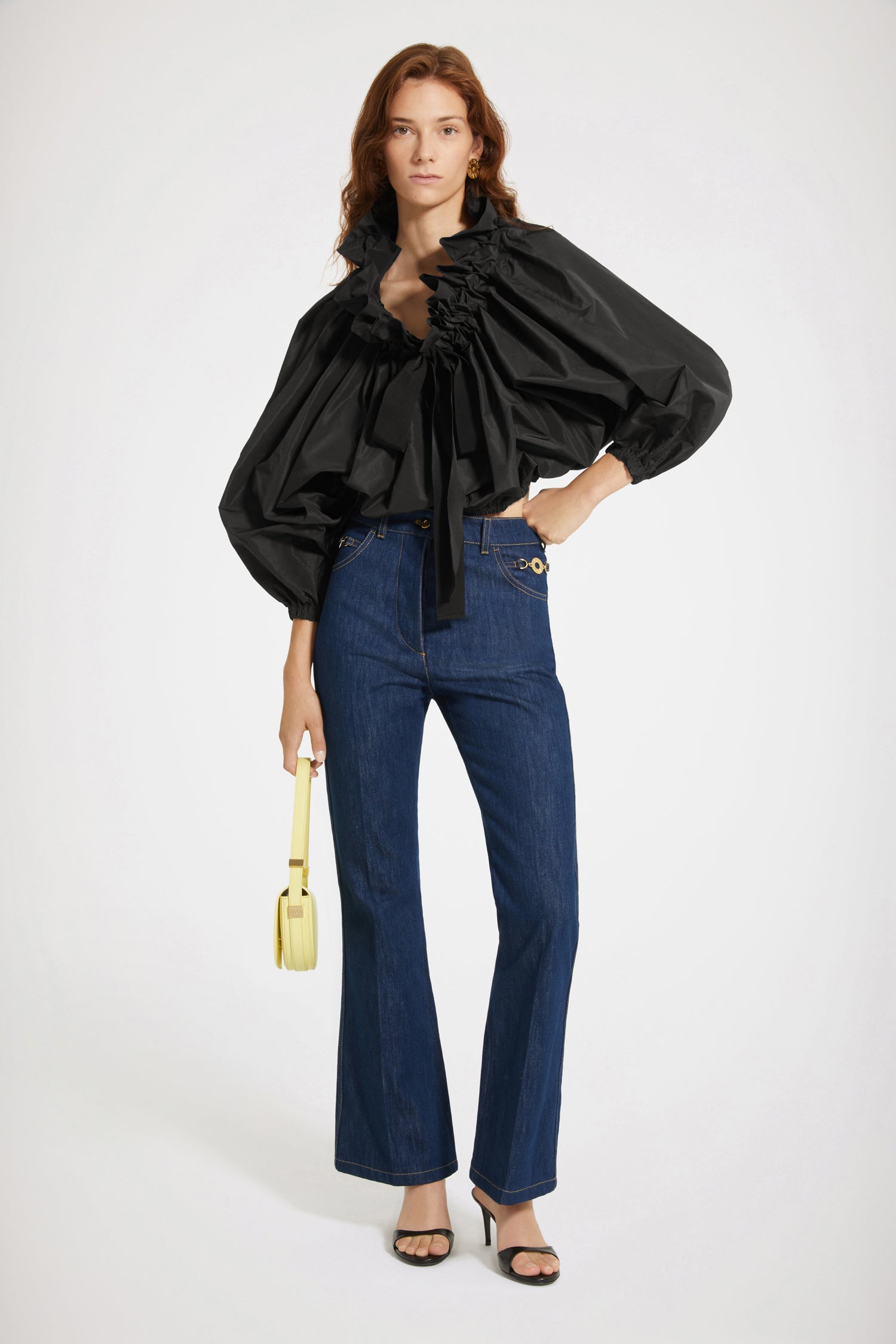 Top in faille riciclato nero. Vestibilità oversize. Può essere indossato chiuso sul collo o in modo da scoprire le spalle. Collo con dettaglio di balza sul davanti e coulisse in grosgrain. Maniche a pipistrello con polsini elasticizzati. Vita elasticizzata.