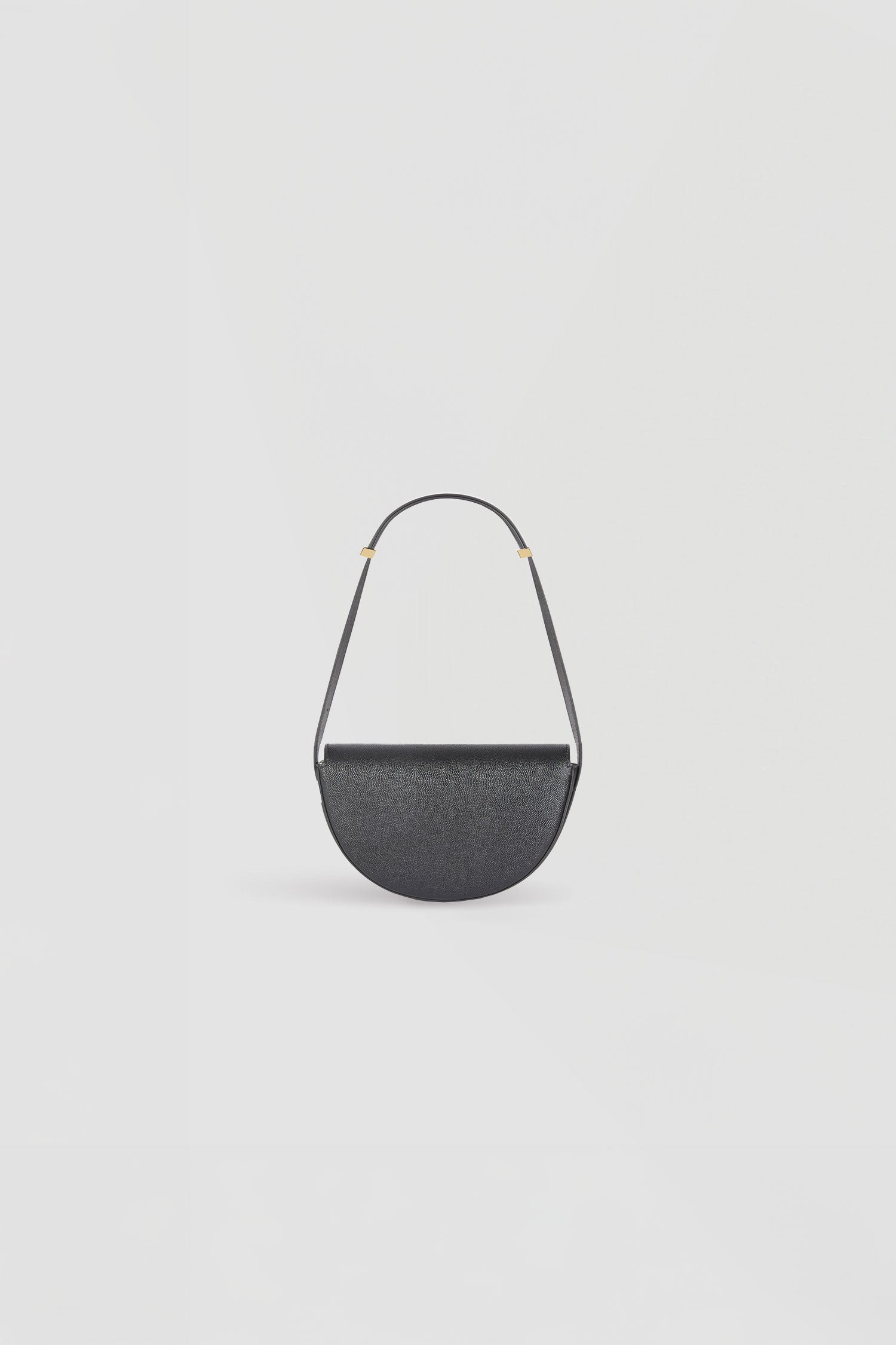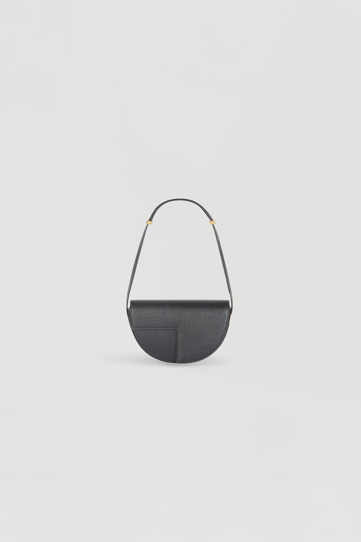 Borsa in pelle nera. Realizzata con pellami recuperati dal ciclo di produzione. Edizione limitata e numerata di 120 esemplari. Forma a mezzaluna con tagli geometrici ispirati al monogramma JP. Dettaglio in metallo oro inciso Patou al lato. Tracolla regolabile che permette di indossarla in più modi: in spalla, crossbody o a mano. Chiusura magnetica con dettaglio JP oro. Fodera eco-friendly.