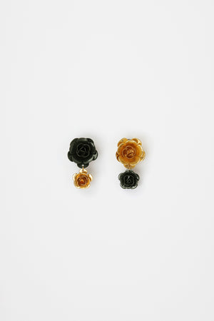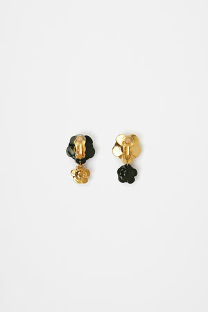 Orecchini oro e verde Muschio d’Inverno. Forma composta di due fiori di dimensioni diverse. Chiusura a farfalla.