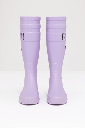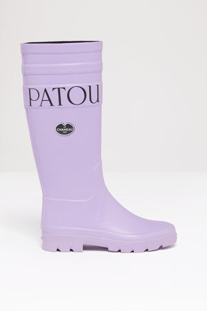 Stivali in gomma color lavanda. Modello esclusivo nato da una collaborazione speciale con la maison francese Le Chameau, esperti riconosciuti di stivali. Impemeabile con interno traspirante. Loghi Patou e Le Chameau neri al lato. Punta tonda.