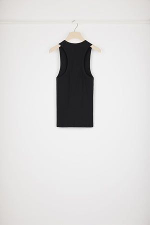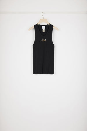 Canotta in cotone bio nero. Tessuto a costine. Scollo rotondo. Medaglione oro inciso Patou e doppia cucitura sul davanti.