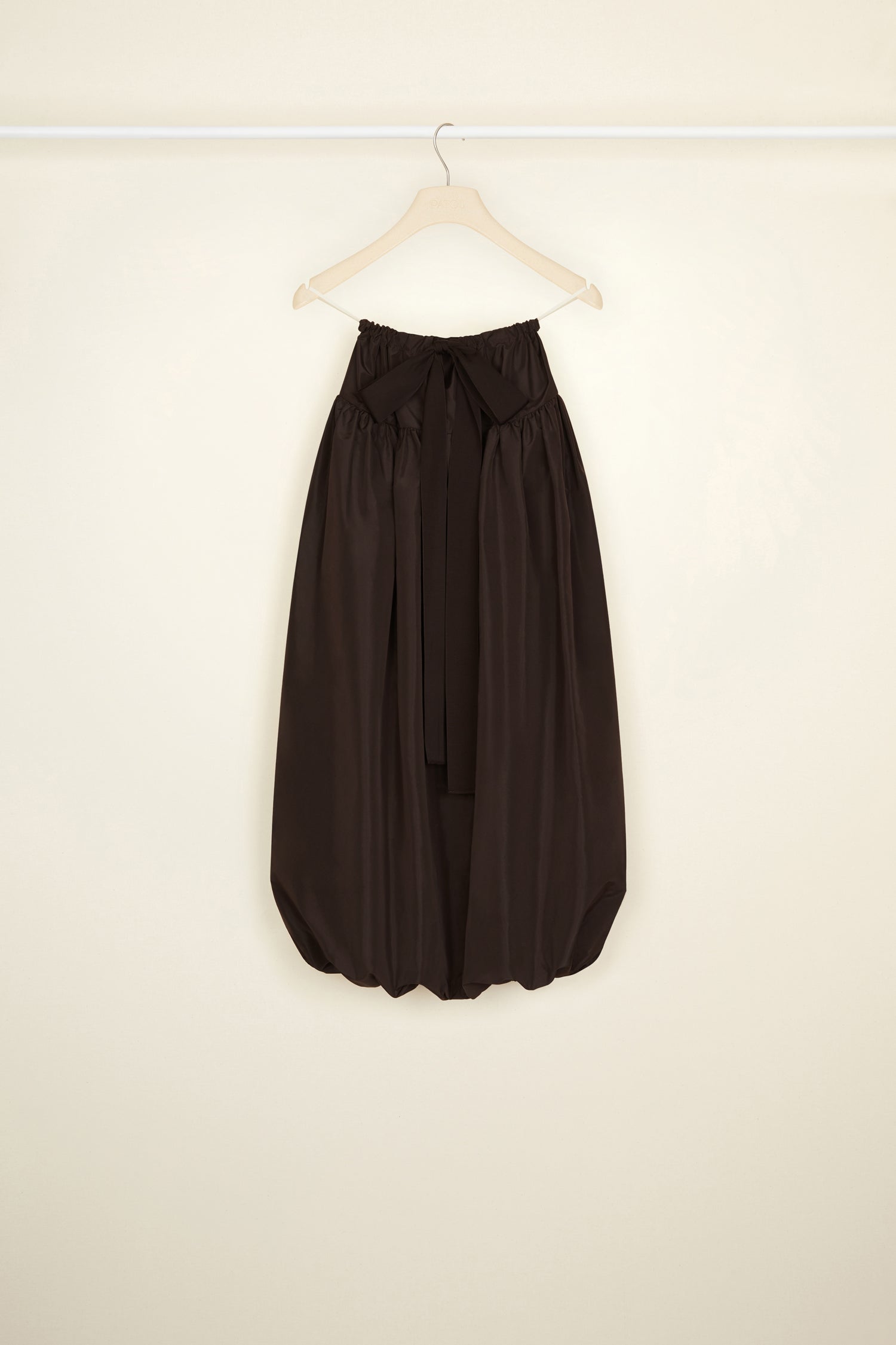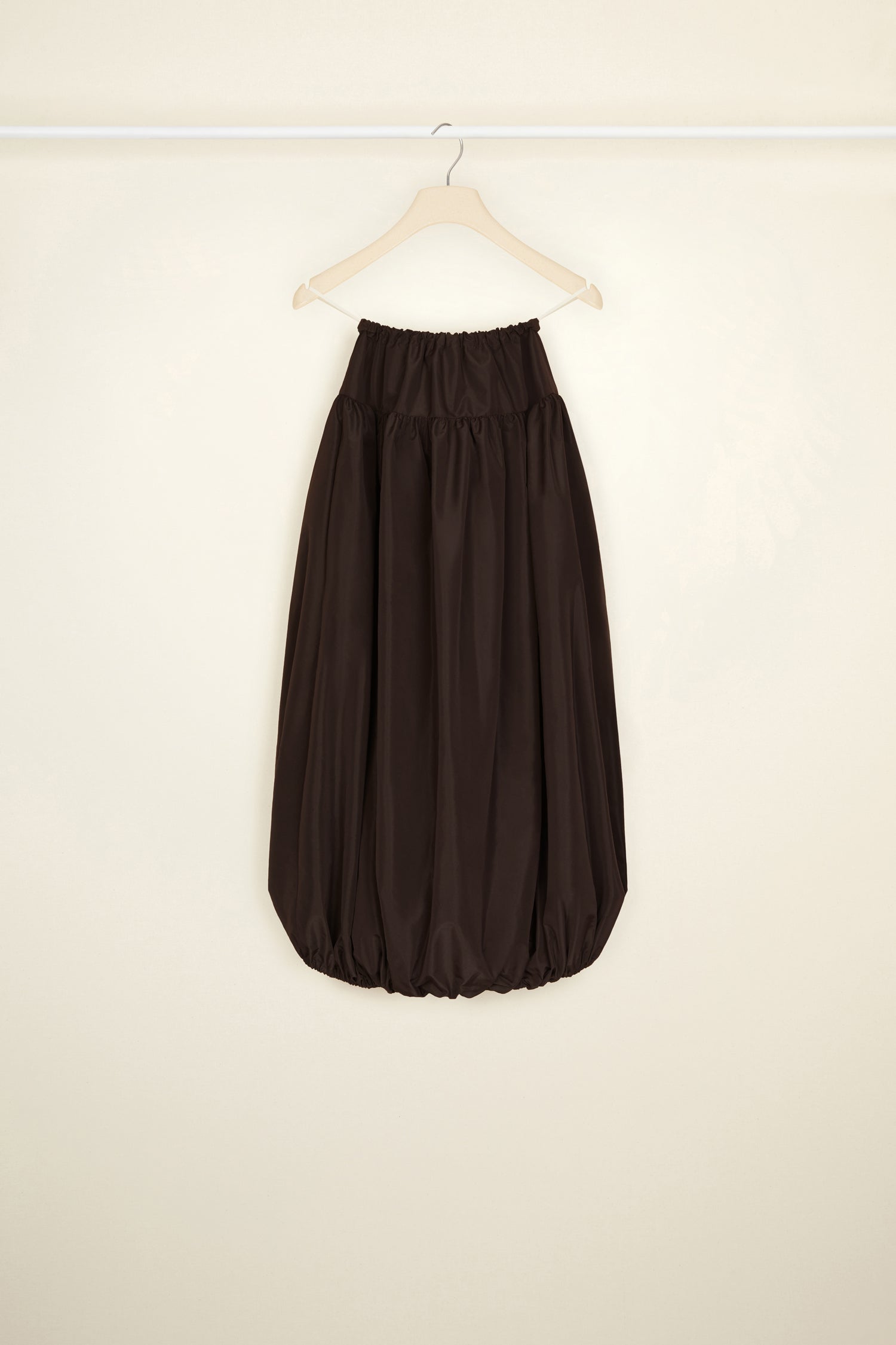 Gonna a palloncino in faglia riciclata marrone Havana. Modello midi di cui la lunghezza può essere regolata grazie a un orlo elasticizzato. Vita elasticizzata con dettaglio di grosgrain. Tasche ai lati.