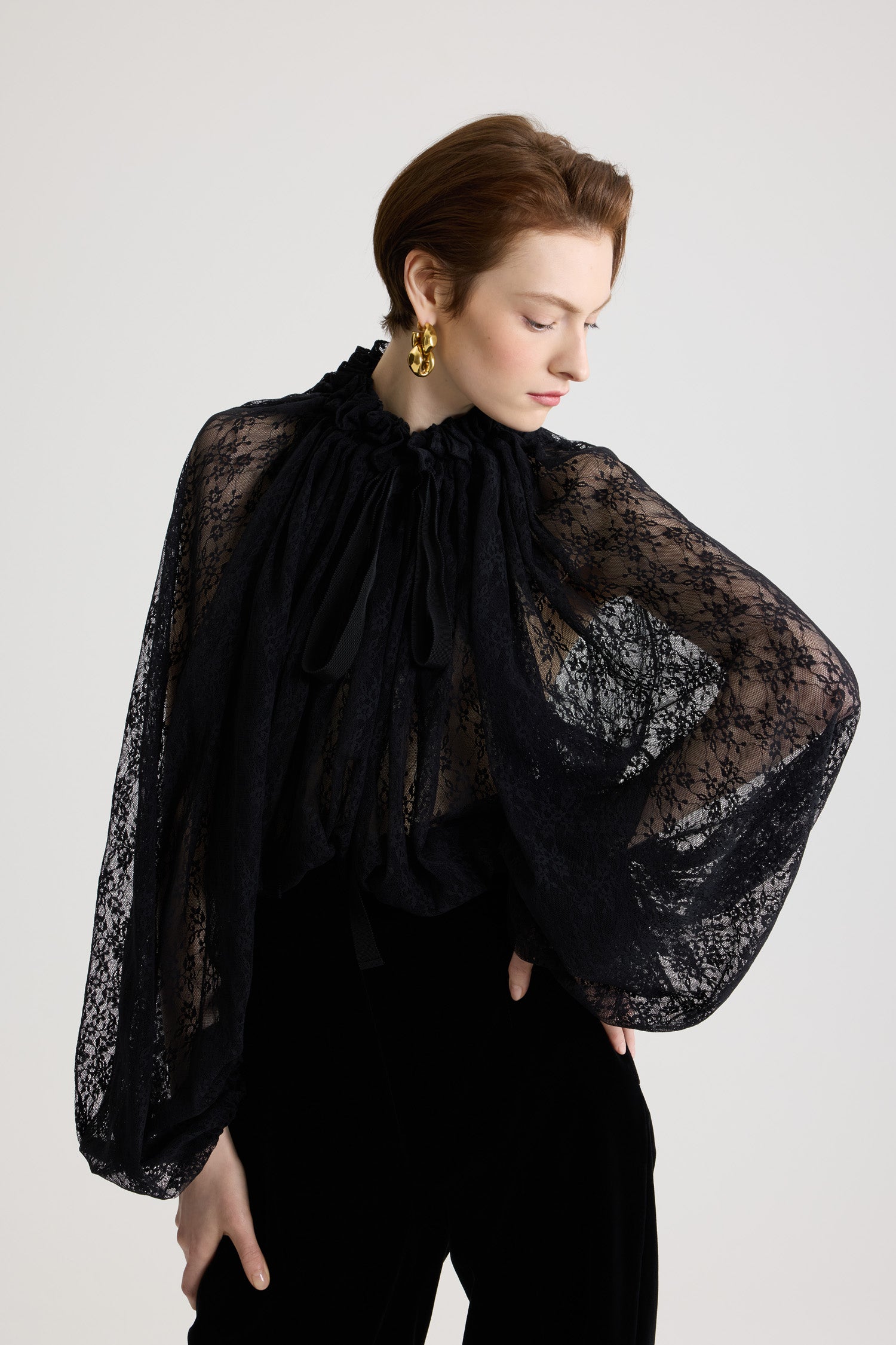 Top in jersey di pizzo nero. Collo con coulisse con volant sul davanti e lacci lunghi in grosgrain. Maniche a pipistrello con polsini elasticizzati. Vita elasticizzata.